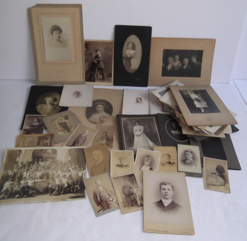 Collection of 50 antique photos, mostly cabinet cards. Stains; foxing; creases; tears.