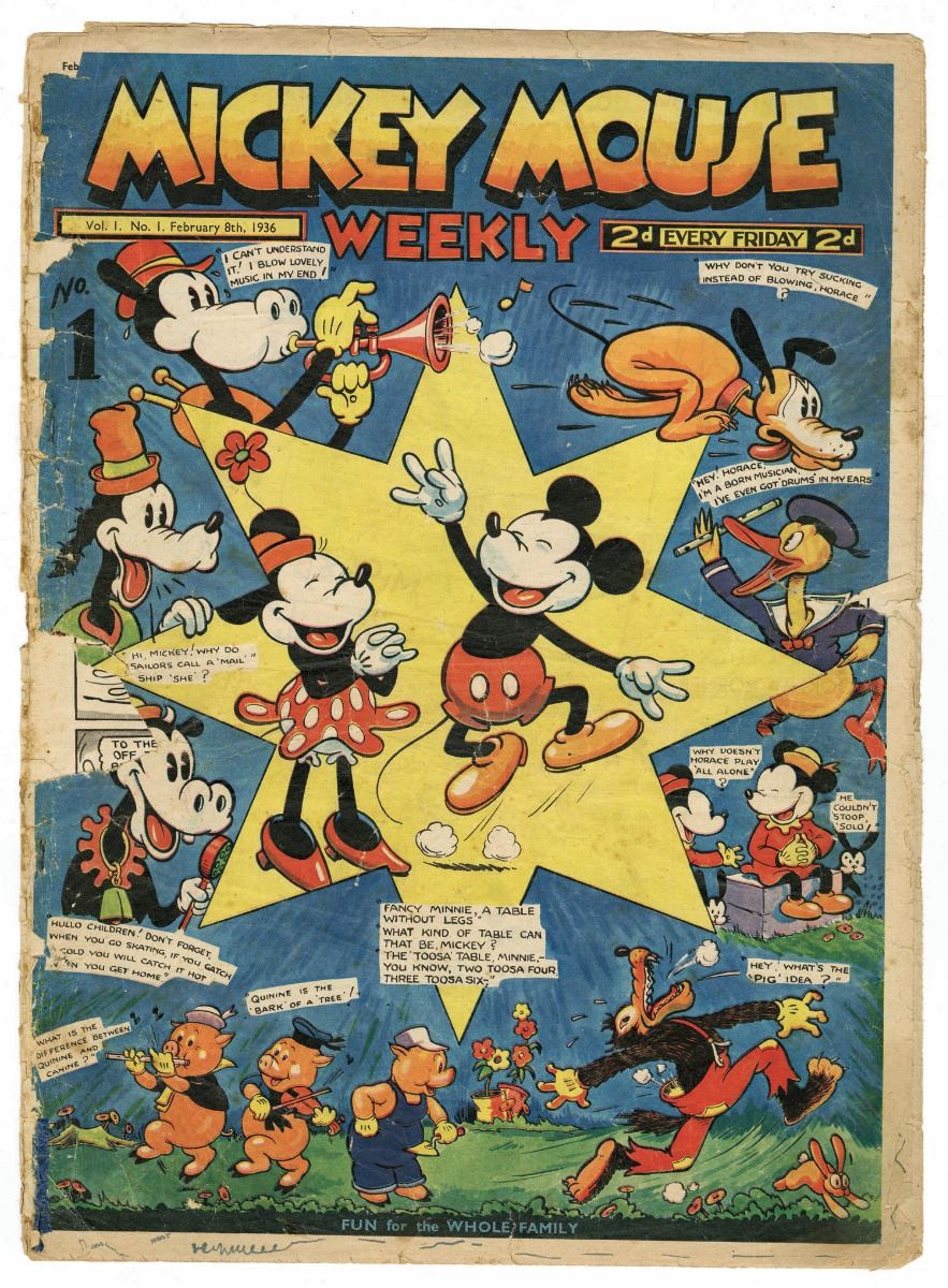 (Wilbank Publications, 1936-37) The first (52) issues of "Mickey Mouse Weekly", a weekly British comic publication that ran until 1957. Each weekly measures 15"x11". In varying condition, most ranging from good to very good.