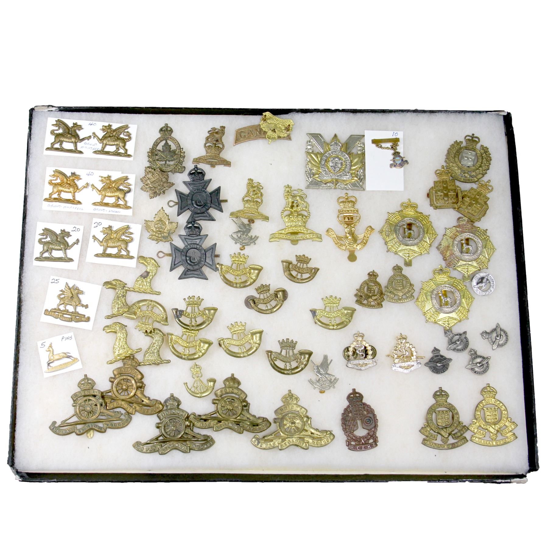 Collection of 55+ Military Badges. You will receive various badges such as: RCEMCE, RCAF Pin, Royal Canadian Army Medical Corp, South Saskatchewan Regiment, Princess Patricia's Light Infantry Collar badge, The Canadian Provost Corps and More. Please view image for further information.