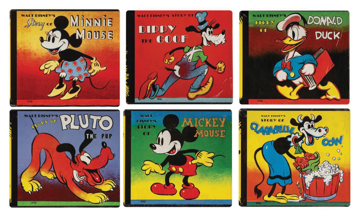 (Applewood Books, 1996) A collection of (6) limited edition Disney Character boxed sets. Each set includes a facsimile of a vintage children's book and CD recording of the respective story. Originally published in 1938, these books provided young readers with an introduction to Mickey, Minnie, Pluto, Donald, Clarabelle and Dippy (Goofy's original name). The CDs feature an exclusive reading of the story, featuring character voices and narrated by Horace Horsecollar. These boxed sets were limited to only 2,500 copies each. Each box measures 5.25"x5.25". All items are in very fine condition and remain unopened.