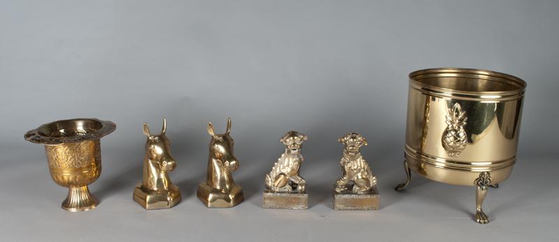 Includes a large three-footed planter with pineapple design, 13.25" H x 12" Dia. A urn form planter with grape and leaf designs, 8.75" H. A pair of filled horse head bookends, 9.5" H. And a pair of filled Foo Dog bookends, 8.5" H. All in very good condition.