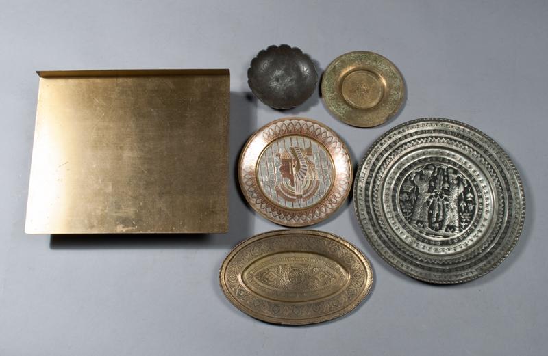 Includes a brass four footed book holder, a metal charger with two regal figures, a small brass floral and scroll plate, a brass, copper and metal Egyptian plate, an oval brass dish with floral designs, and a metal censor with etched dragon. Largest measures 13" L, all with wear consistent with age and use.