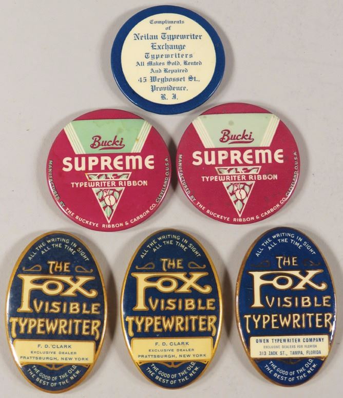 Collection of 6 Celluloid Advertising Pocket Mirrors for Typewriters/Ribbons. Neilan Typewriter Exchange, (3) Fox Visible Typewriter and (2) Bucki Supreme. Overall good to excellent condition. Fox measures 2 3/4 inches tall.