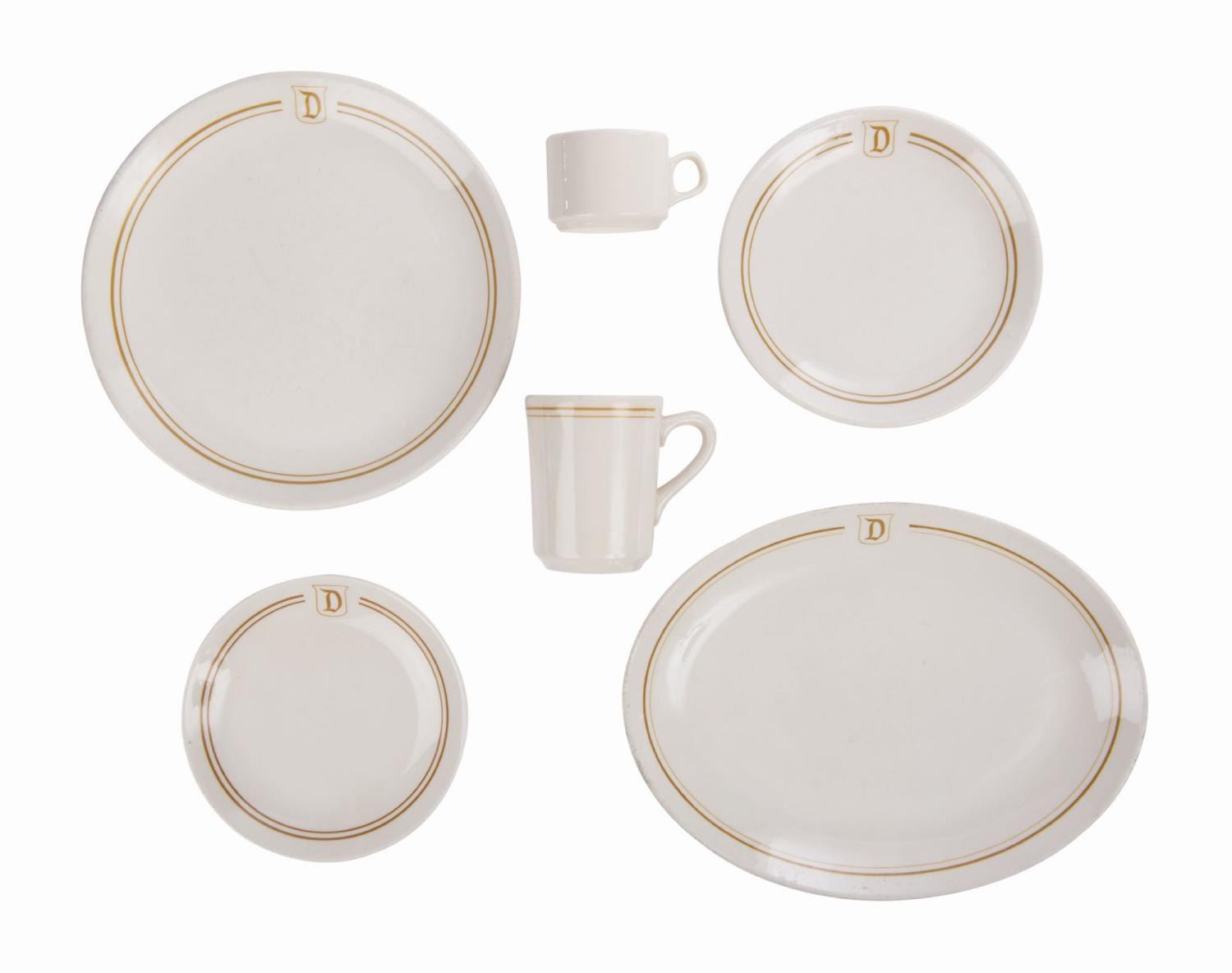 (Disneyland, c.1990s) A collection of (6) Park-used ceramic dishes from Disneyland. The set contains the following Homer Laughlin pieces: a 1994 bread plate, a 1990 salad plate, a 1990 dinner plate, a 1991 oval platter, and a coffee mug with a relief maker's mark on the bottom of the base. An Oneida demitasse mug marked "0801M" is also included. All the Homer Laughlin pieces feature the signature Disneyland "D" shield and thick gold ring accents. Ranging in size from 2.25" tall x 3.5" in diameter to 8.75"x11.5", the collection is in generally very good condition with some surface wear and scuffing to edges and bases.