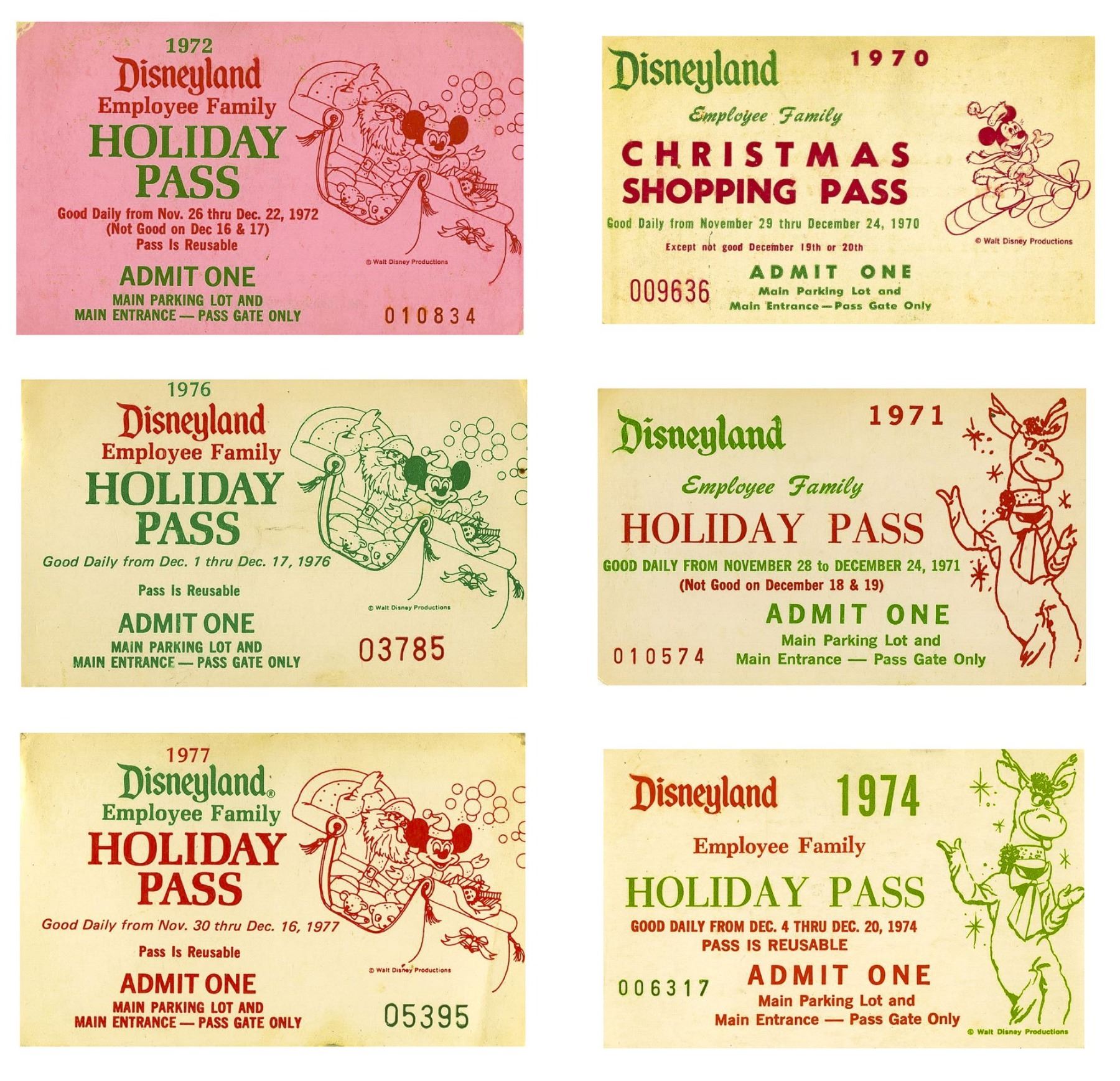 (Disneyland, 1970-77) A rare collection of (6) employee passes for Disneyland to be used for Christmas Shopping. These scarce passes admit the employee to the main parking lot and main entrance, and several of the backs of the passes mention 15% or 20% discounts at the Disneyland shops. The passes feature great Disney holiday imagery and measure 2.25"x4". The condition is good with some edge-wear from use.