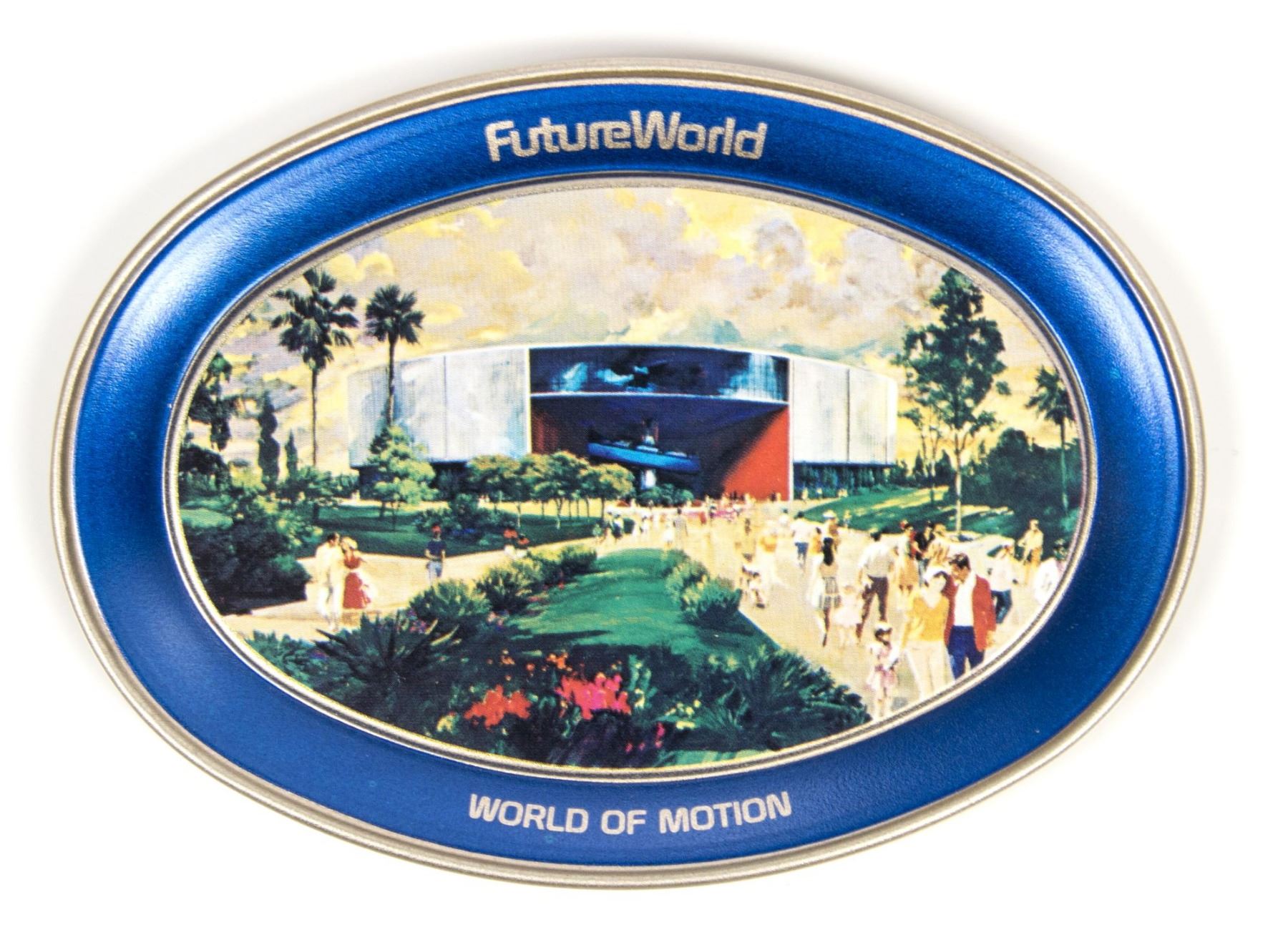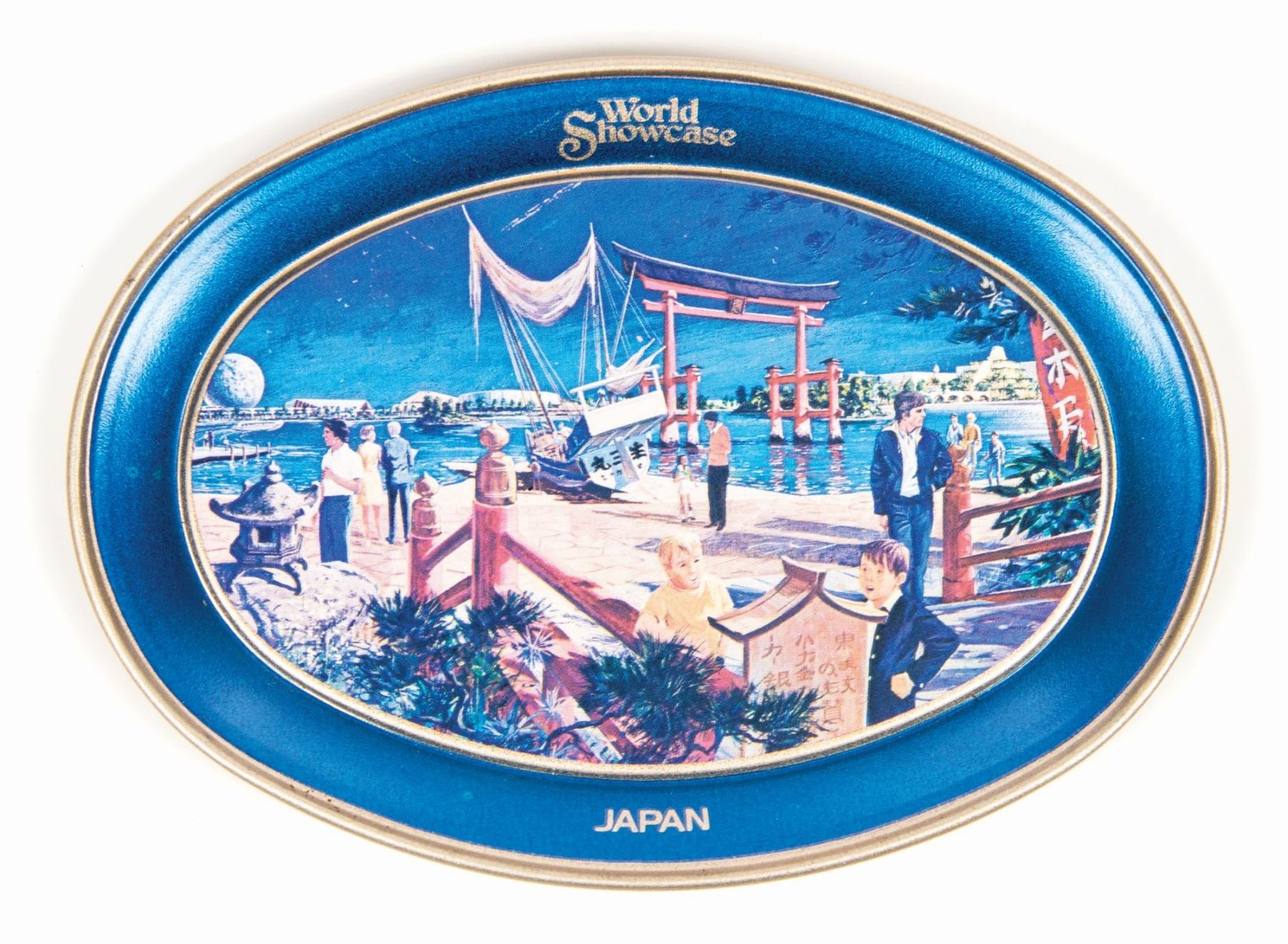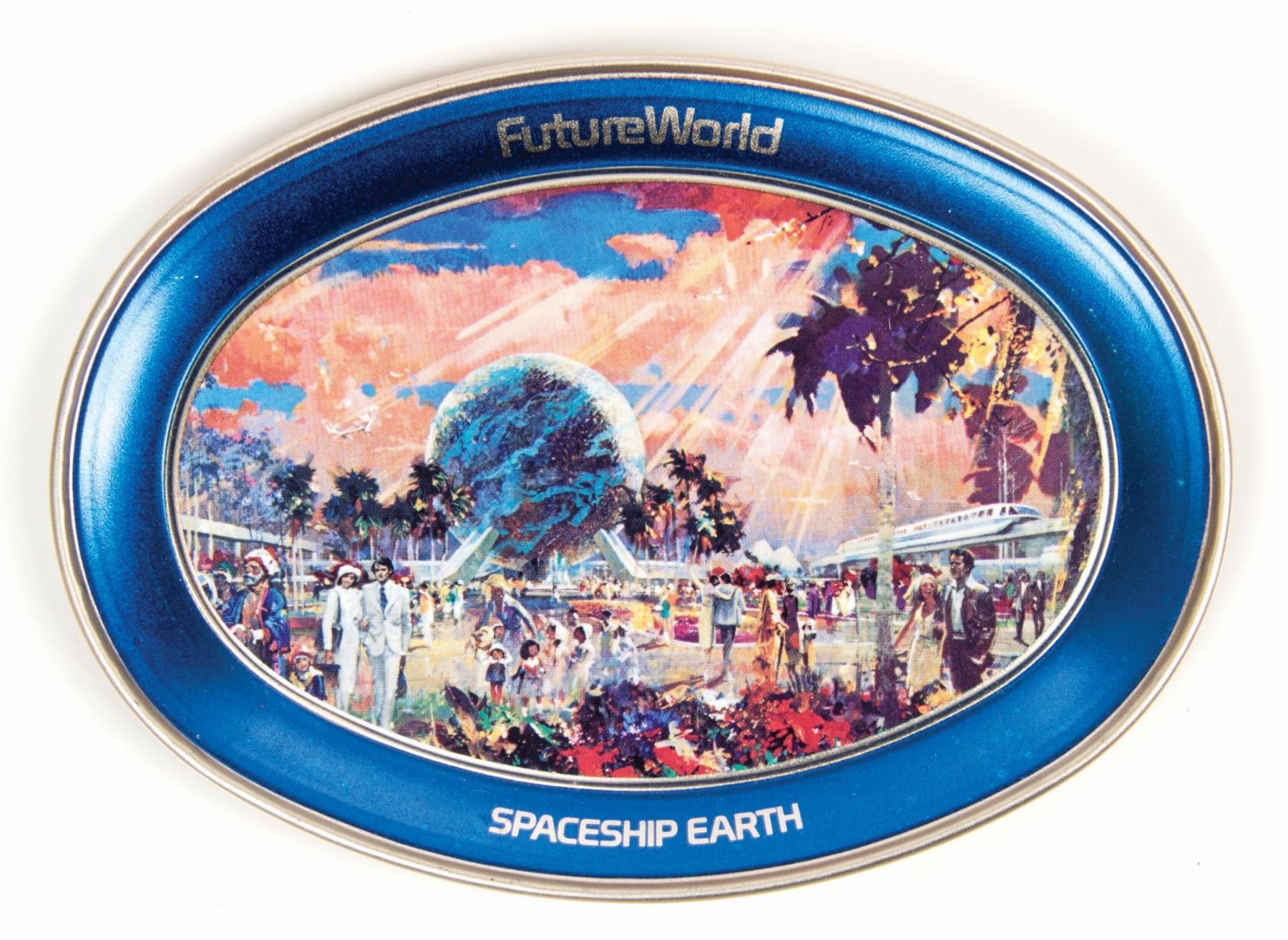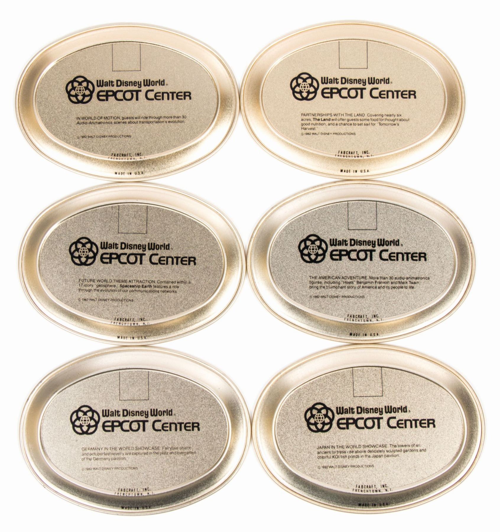 (EPCOT, 1982) A collection of 6 EPCOT Center tin trays with artist renderings of locations in "FutureWorld" and the "World Showcase". These trays feature such attractions as "World of Motion", "The Land", "Spaceship Earth", "American Adventure", "Germany", and "Japan" with text on the back of each describing the attraction. The items measure 4.5"x6.25" and are in very good condition with some wear around the rims.