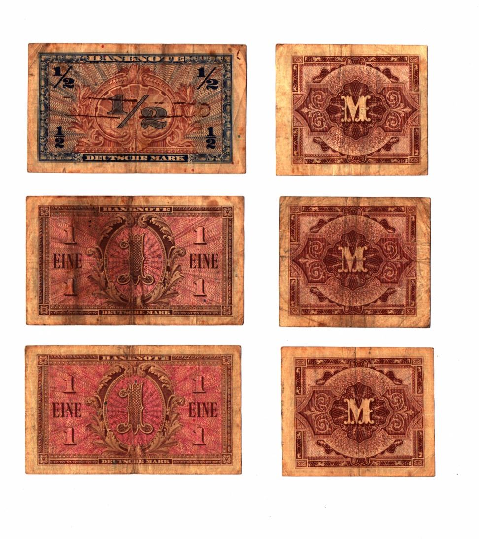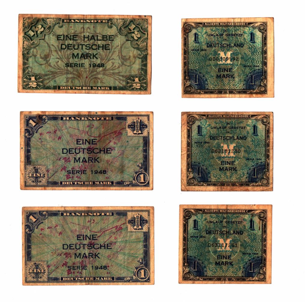 Collection of 6 Federal German banknotes under the Rule of Allied Forces, 1944-8, includes: three 1 Mark banknotes (1944), two 1 Mark notes (1948), half Mark note (1948), conditions VF-XF.