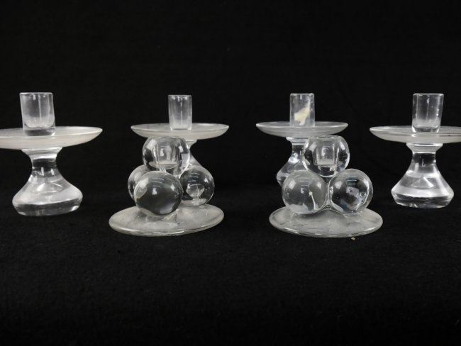 4 matching glass candlesticks with large glass drip dish and sculpted base. Marked Steuben on the underside of the base. [Approx: 5 1/2" H x 6" D]. In good condition. 1 pair of glass candlesticks [Approx: 4 1/2" H x 4 1/4" W].