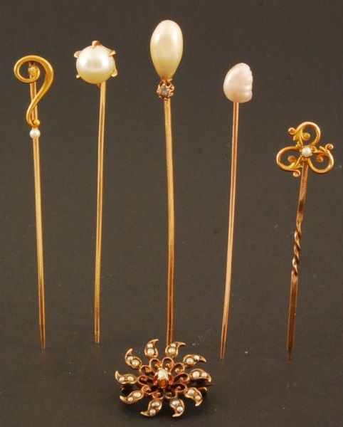 10.2Grams, 5 Stick pins and 1 Lapel pin. Trebel Clef pin marked 14k.