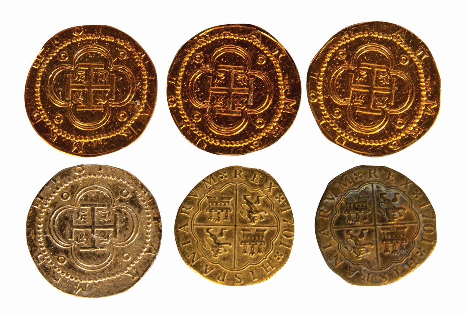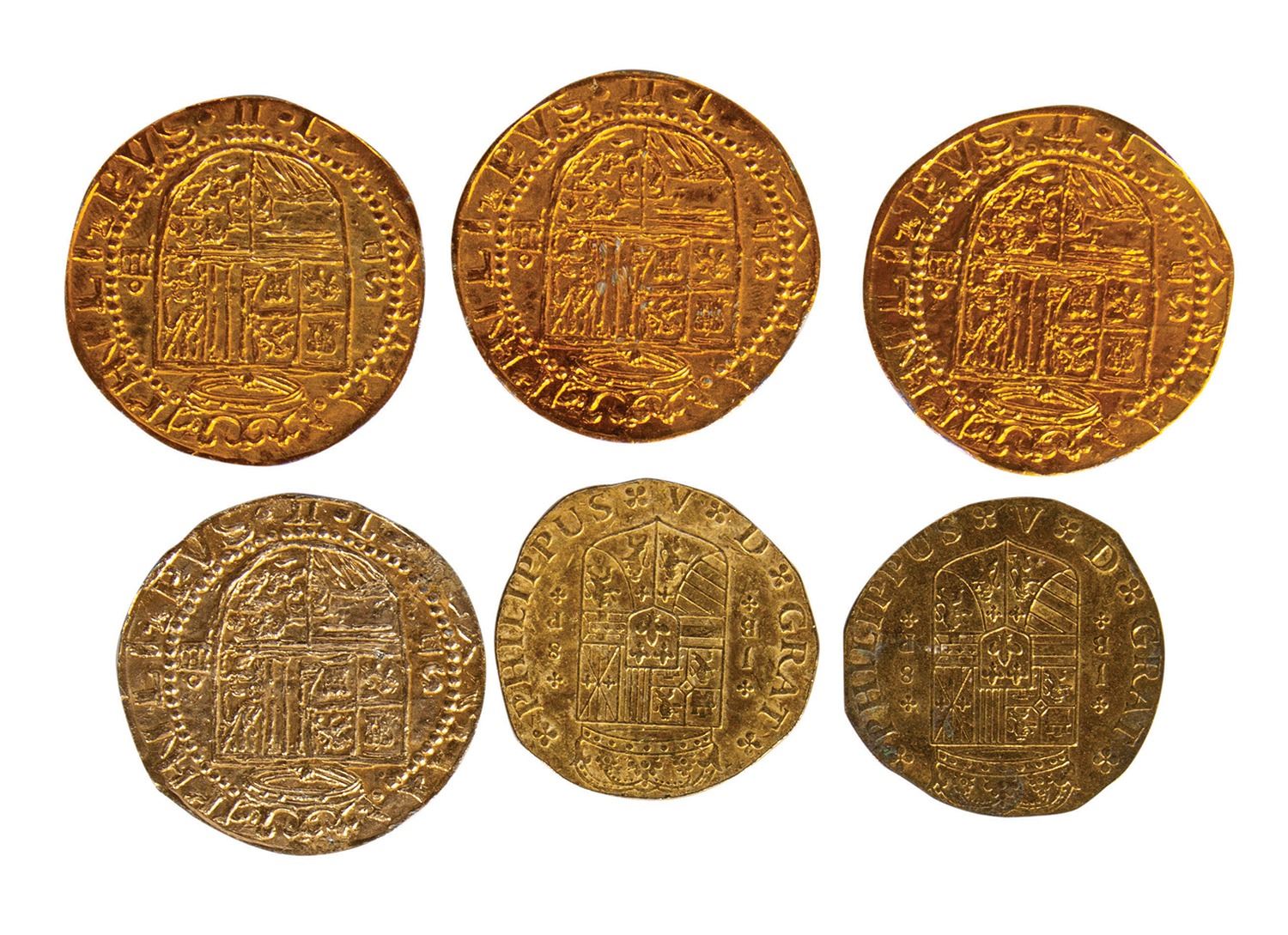 (Disney, 2006) A collection of (6) prop coins from Pirates of the Caribbean: Dead Man's Chest. The coins come in a variety of shapes, colors, and sizes, but feature similar embossed imagery based on early Spanish currency. The coins range in size but measure approximately 1.5" in diameter. The condition is good with expected wear and tarnishing from production use.