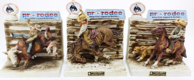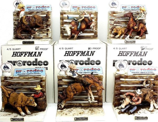decanters including saddle bronc, steer wrestler, bareback, bull rider, calf roper and all around cowboy 1975-1978. Nice collection of all six with original boxes. Est. 150-300