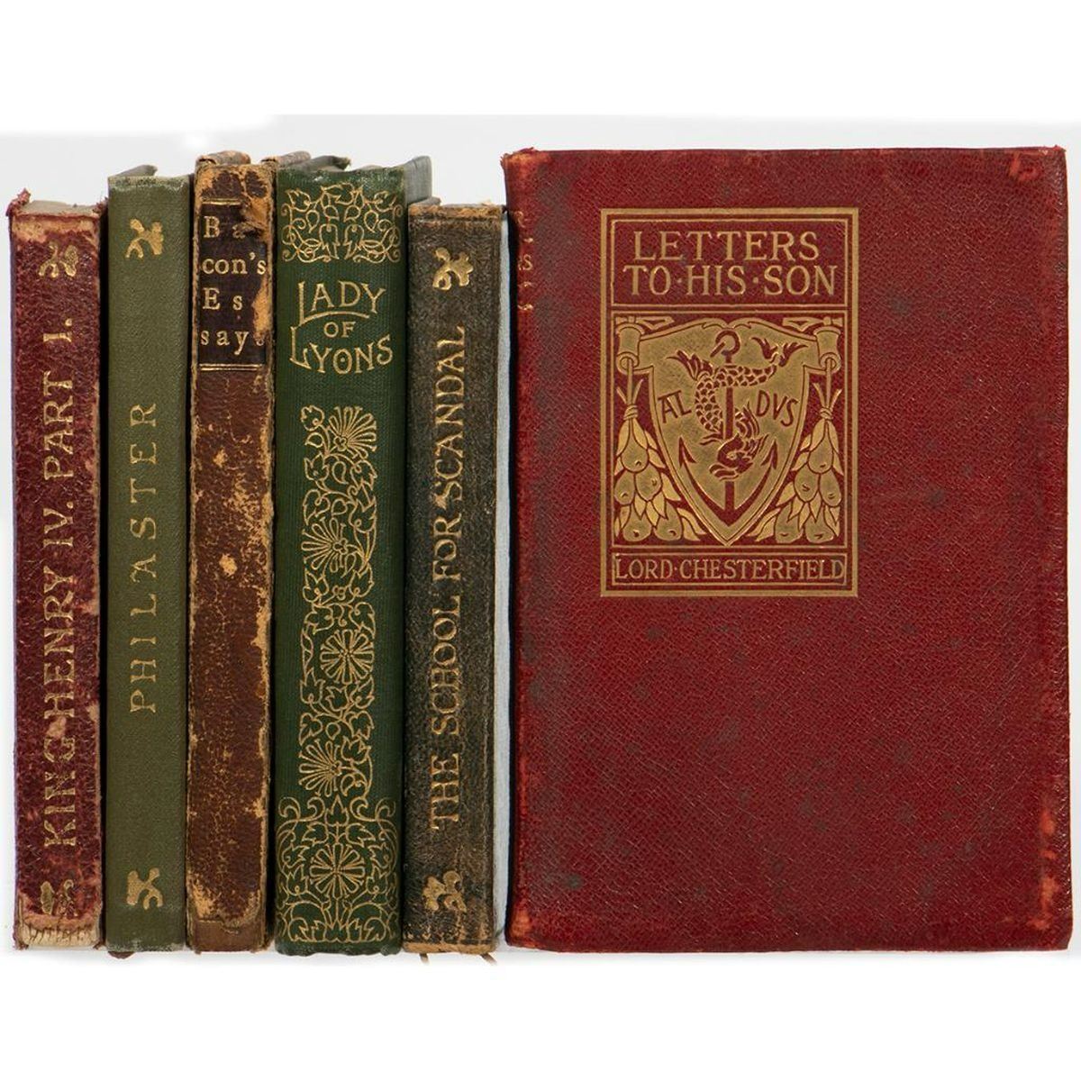 All in Fair-Good; both cloth and leather-bound, 5" to 5 1/2": 1. BACON'S ESSAIES, BEING A FACSIMILE OF THE FIRST EDITION. New York: Dodd, Mead & Company, 1904. 2. BEAUMONT, FRANCIS, and JOHN FLETCHER. Philaster, or Love Lies A-Bleeding. London: J. M. Dent and Co, 1898. 3. CHESTERFIELD'S LETTERS TO HIS SON. New York and Boston: H. M. Caldwell Co., 1900. 4. LYTTON, EDWARD BULWER. The Lady of Lyons and other Plays. London: Walter Scott, 1890. 5. SHERIDAN, RICHARD BRINSLEY. The School for Scandal. London: J. M. Dent and Co., 1905. 6. SHAKESPEARE'S FIRST PART OF KING HENRY IV. London: J. M. Dent and Co., 1901.