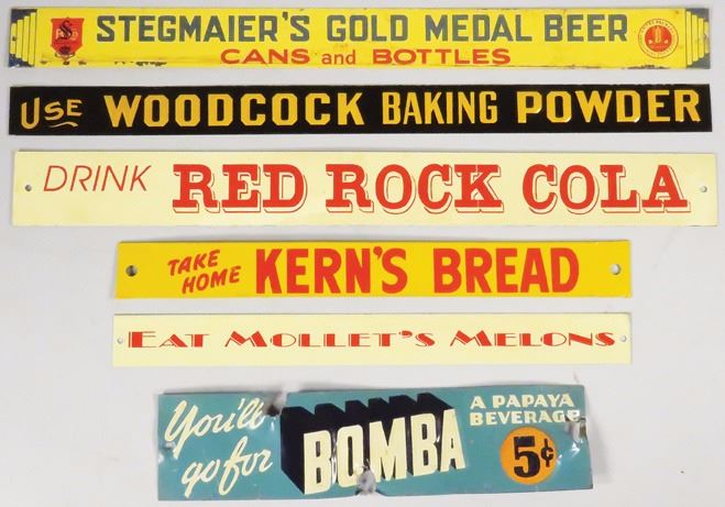 Collection of 6 Tin Shelf Strips. Bomba Papaya Beverage, Eat Mollet's Melons, Stegmaier's Gold Medal Beer, Woodcock Baking Powder, Kern's Bread and Red Rock Cola. Fair to near mint condition. Longest measures 14 inches.