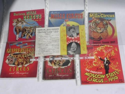 Collection of 6 Vintage Circus Programmes inc Blackpool Tower Circus 1942, Chipperfield’s c1950’s, Chipperfield’s 1953, Bertram Mills Summer 1957, Bertram Mills Olympia 1957-58, Bertram Mills Olympia 1958-59, Tom Arnold Wembley Moscow State Circus 1959 mo