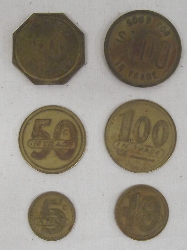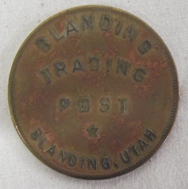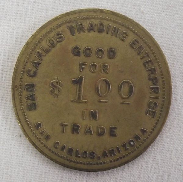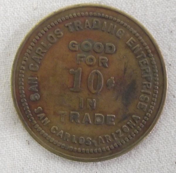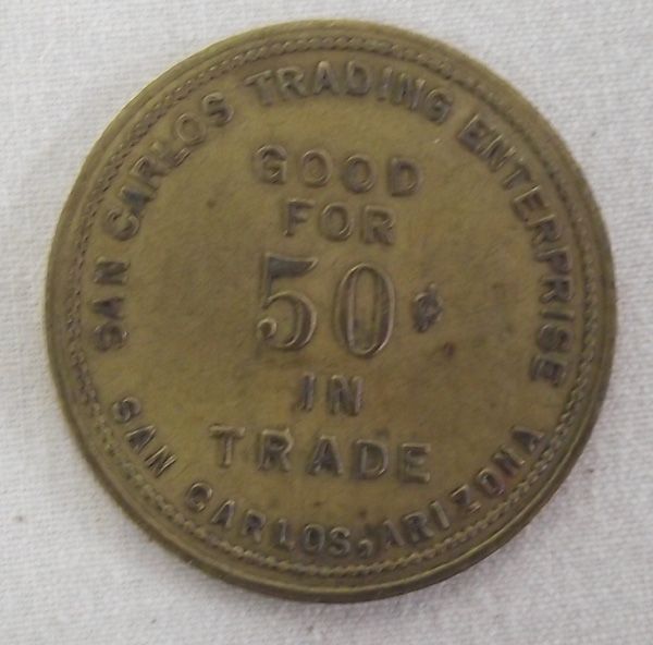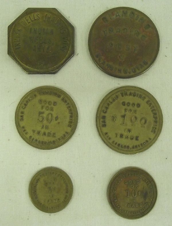 Collection of 6 Vintage Trade Tokens. This collection includes: 4-San Carlos Trade Tokens, 1-Blanding Trading Post Token, and 1 Indian Wells Token. The largest of these pieces measures approx. 1.5'' in diameter while the smallest is .75'' in diameter.