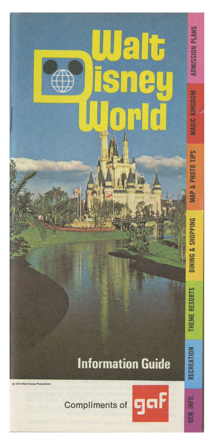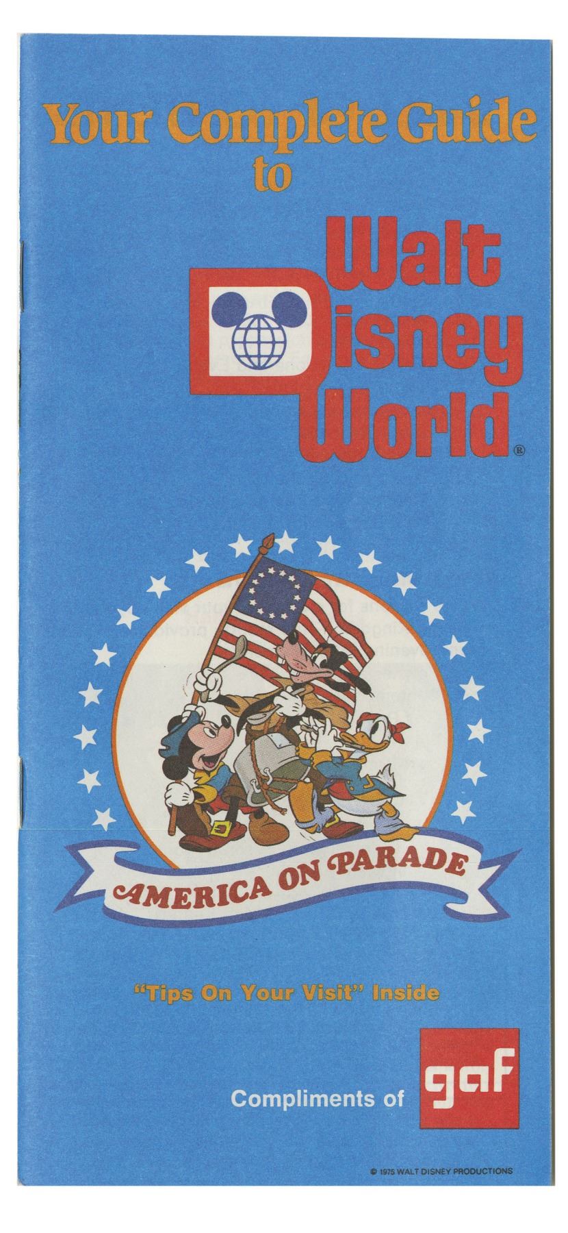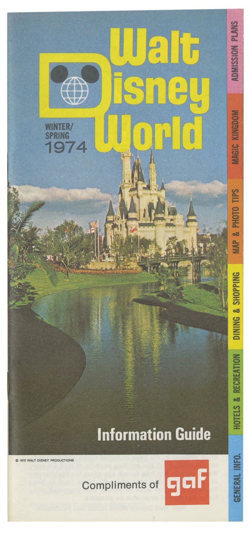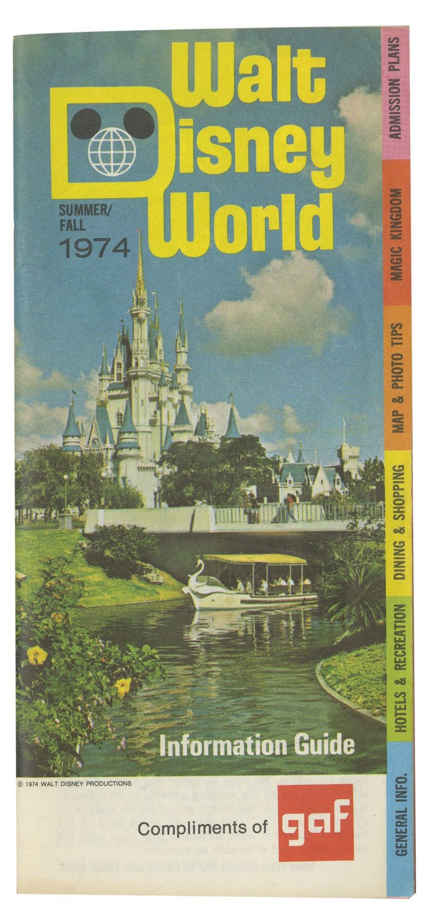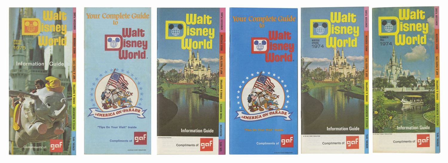 (Walt Disney World, 1972-75) A collection of (6) Walt Disney World guidebooks, offered by GAF. The guidebooks provide a visual history of Walt Disney World during its earliest years, and feature maps, imagery, and general information on the park. Each guidebook has between 28 and 33 pages, and measures 8"x3.75". The condition is very good with minor wear from use.