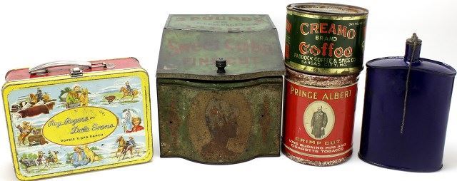counter tin 8"X8"X10", original Roy Rogers and Dale Evans lunch box, early blue enamel flask with original stopper, Prince Albert and Creamo Coffee tin, and Tortoiseshell tin. Est. 175-275