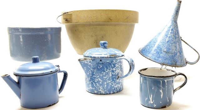 with original wire handle, blue stoneware butter jar, and 4 pieces blue enamel kitchen items. A nice collector lot with all pieces in good condition. Est. 200-300