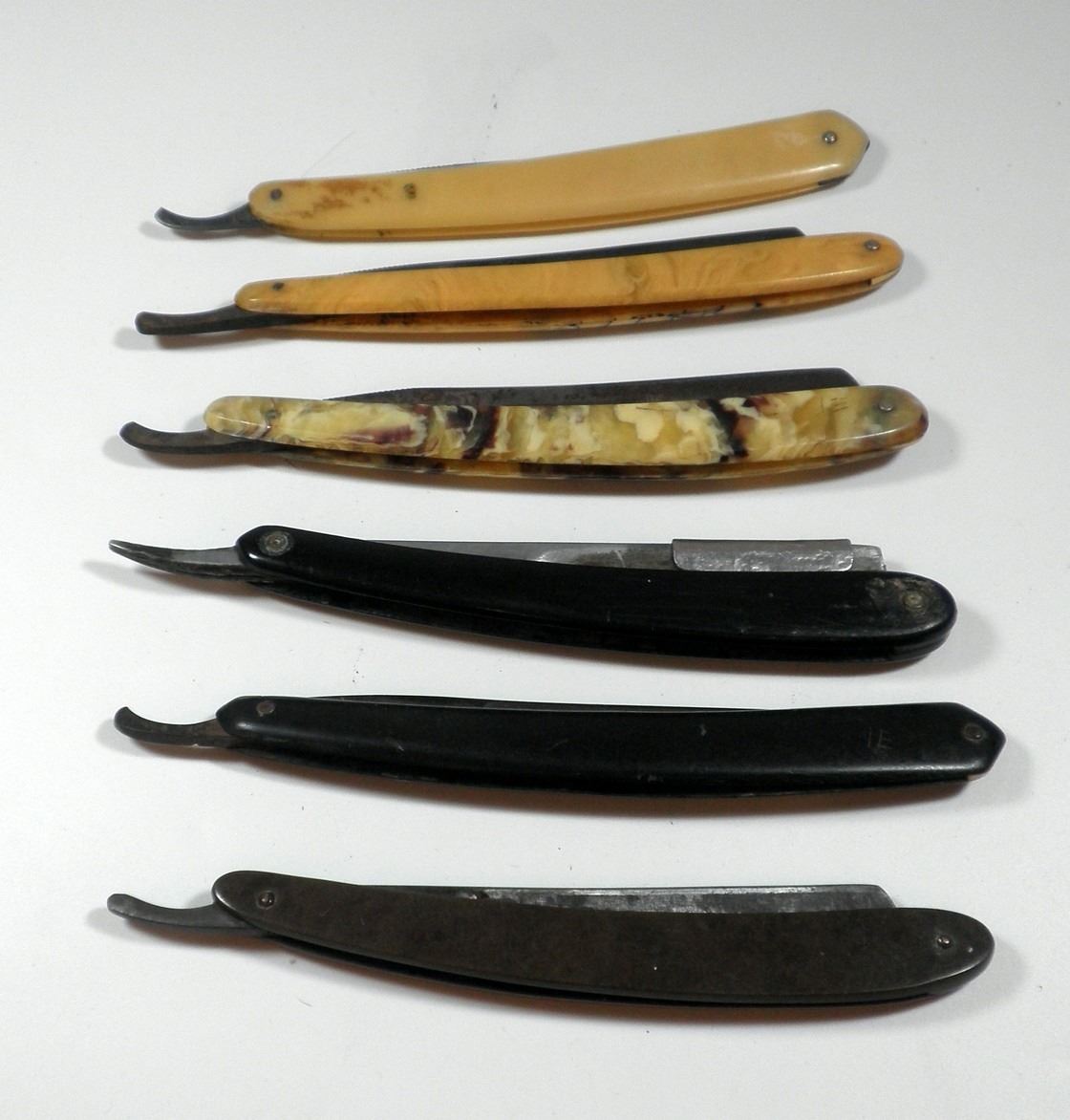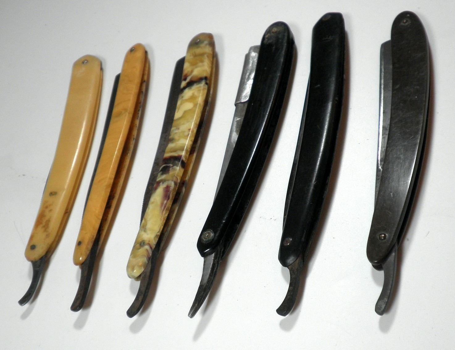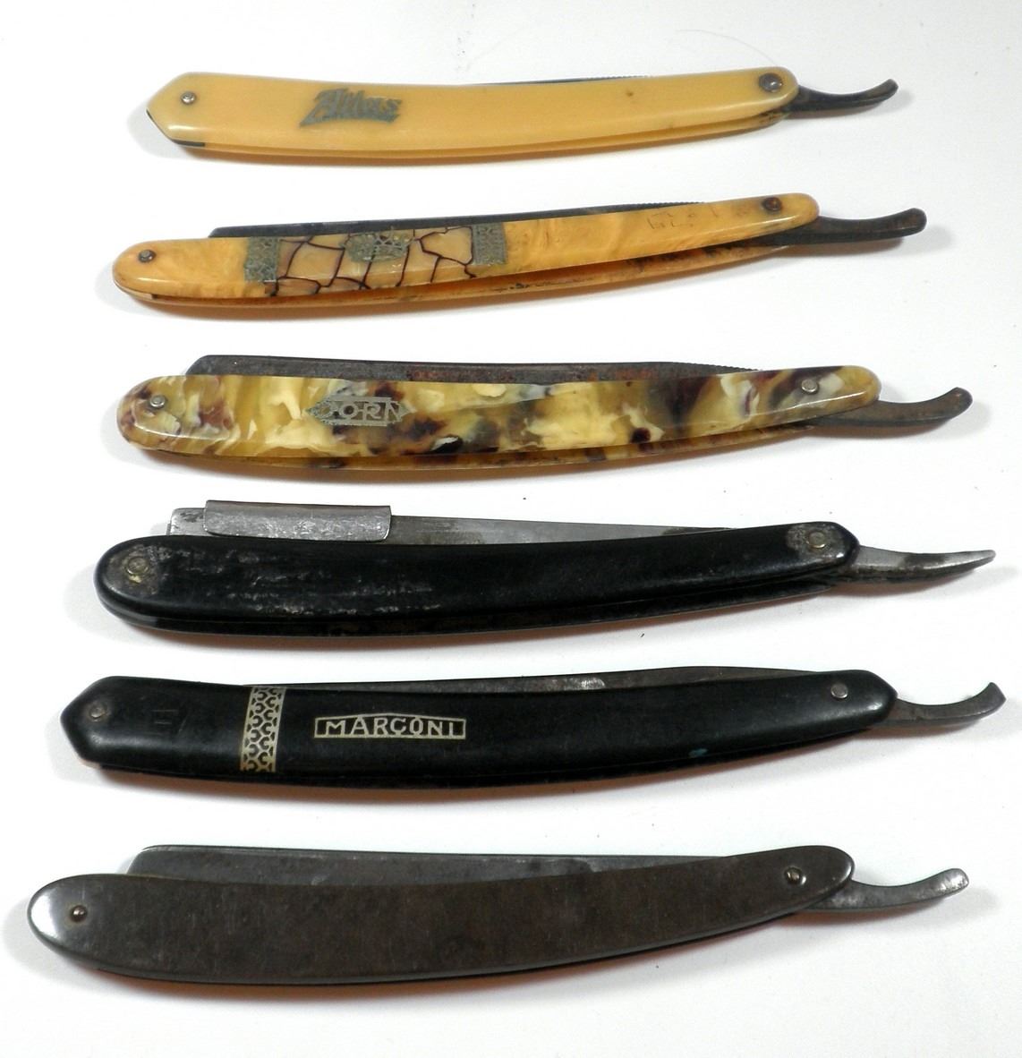 Collection of 6 old shaving knives, first half of the 20th century, with old plastic and wood coating, some are branded, including the following brands: Marconi, Dorn, Atlas. Some of the metal parts are timeworn and corroded . Length: 16 cm in average.
