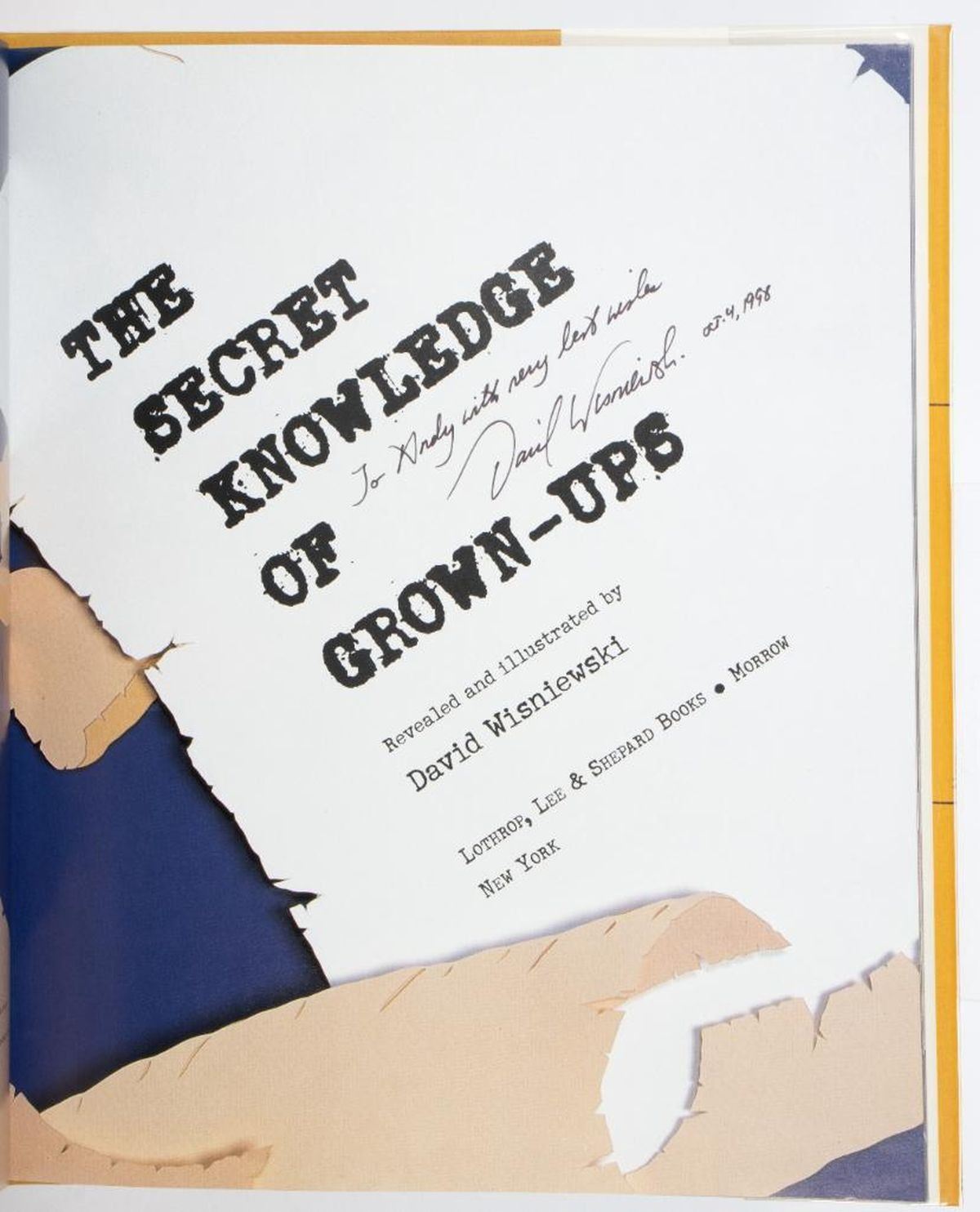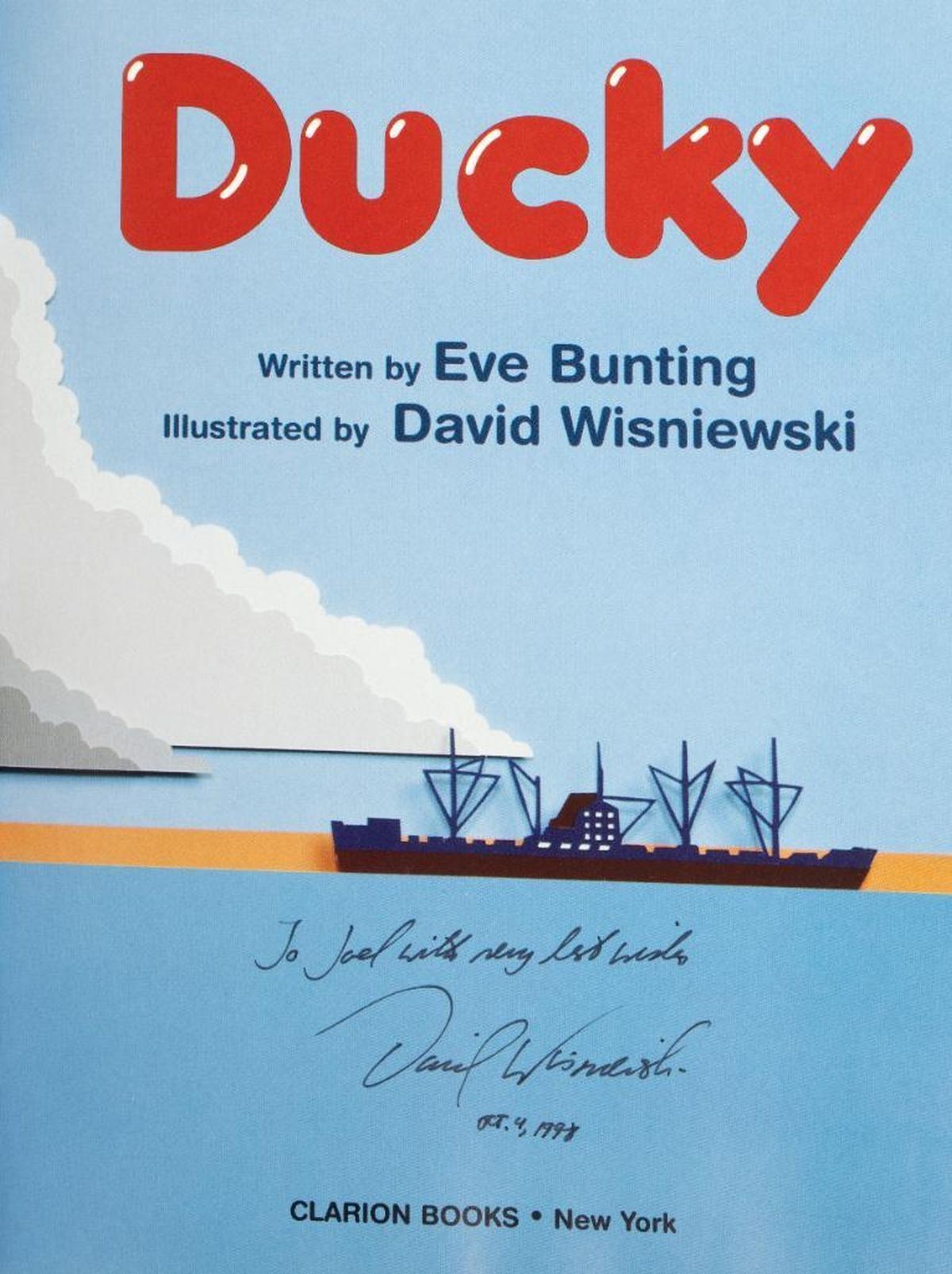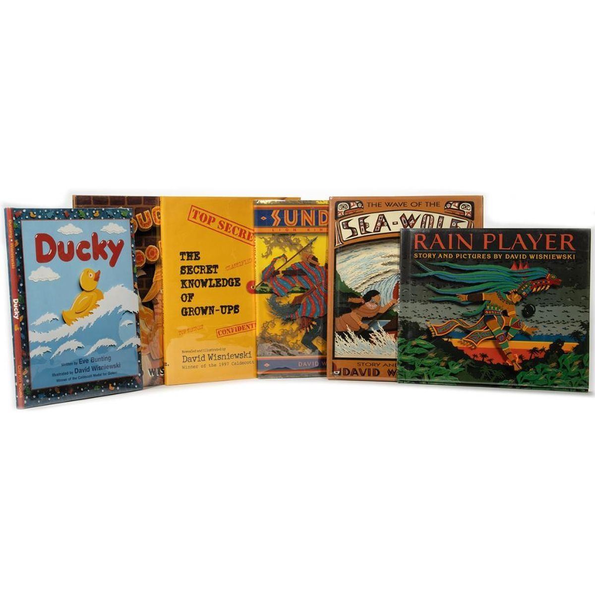 Collection of 6 signed first editions by Caldecott Gold Medalist David Wisniewski. The Wave of the Sea-Wolf, written and illustrated by Wisniewski. Clarion 1994 first edition. Sundiata: Lion King of Mali, written and illustrated by Wisniewski. Clarion 1992 first edition. Rain Player, written and illustrated by Wisniewski. Clarion 1991 first edition. Ducky by Eve Bunting, illustrated by Wisniewski. Clarion 1997 first edition. Tough Cookie written and illustrated by Wisniewski. Lothrop 1999 first edition. The Secret Knowledge of Grown-Ups, written and illustrated by Wisniewski. Lothrop 1998 first edition. All signed by the late Wisniewski. All fine hardcovers in fine jackets.