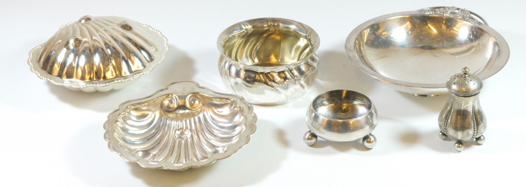 Collection of 6 silver-plated items: 2 different bowls, 2 different salt shakers, shell-shaped vessel with cover and shell-shaped bowl. Silver platting in very good condition.