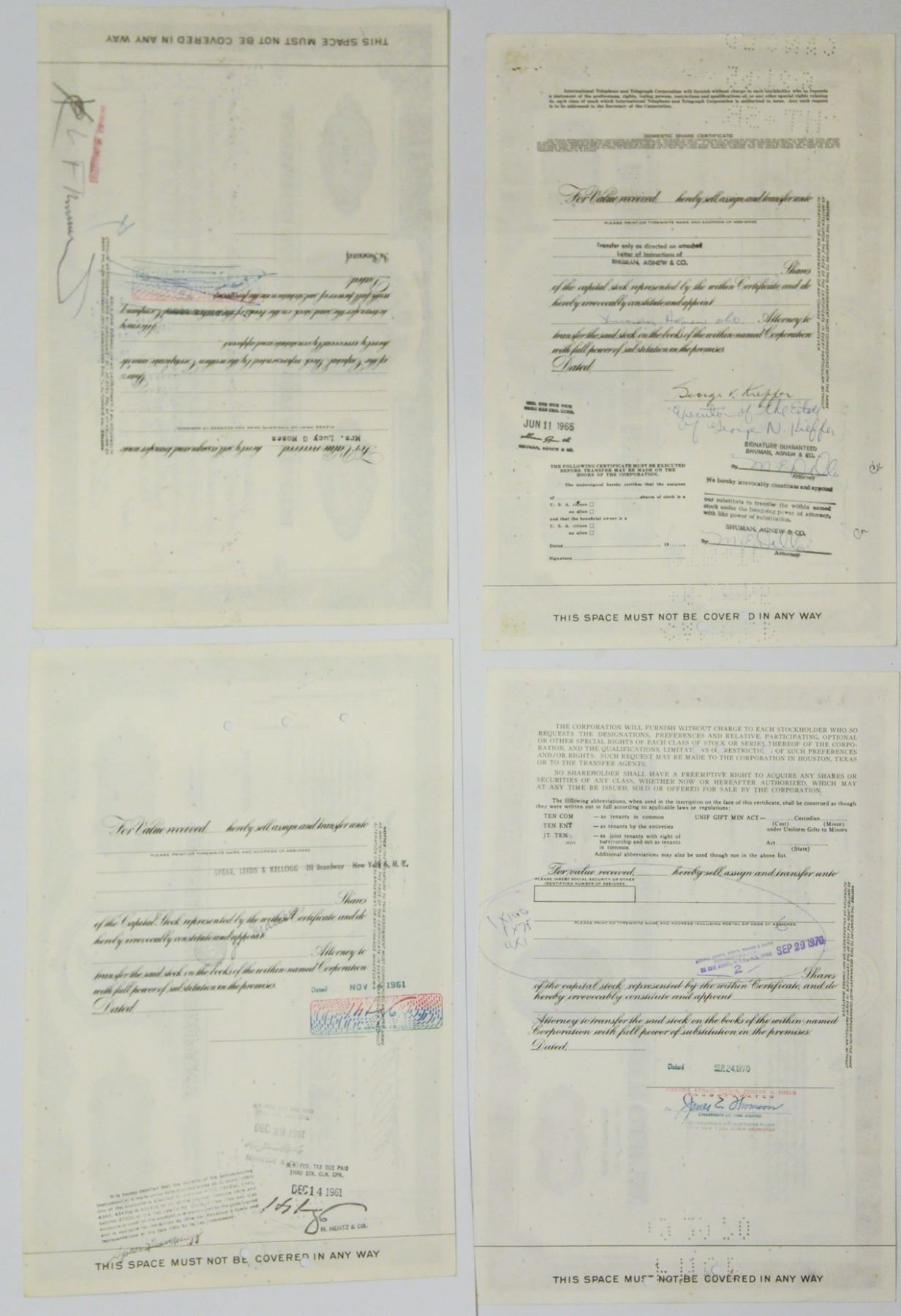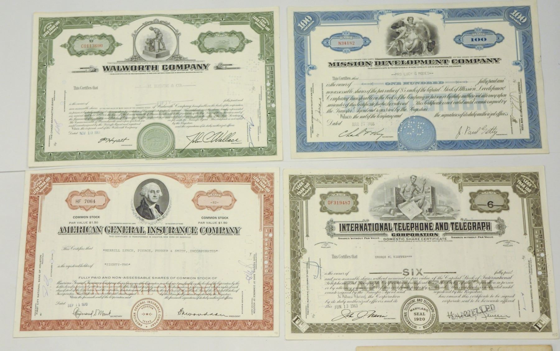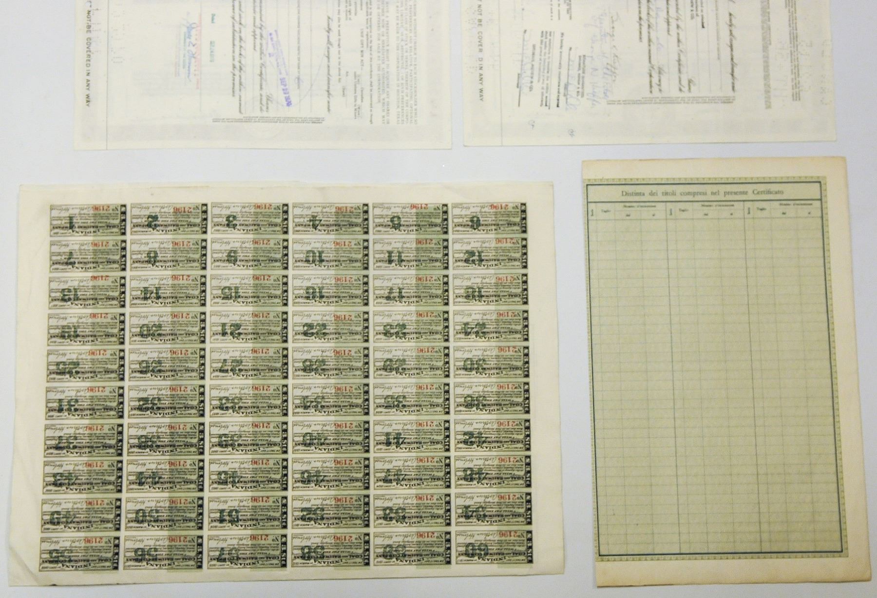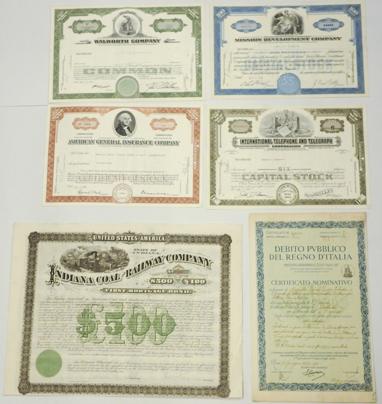 Collection of 6 stock certificates, first half of the 20th century, including: 5 American and 2 Italian. Heading embellished with designs and prints of antique etchings. Dimensions: 4 American certificates: 30x20 cm, Italian certificates: 21.5x34.5 cm, large American Indian Coal Railway Company certificate: 43x32 cm.