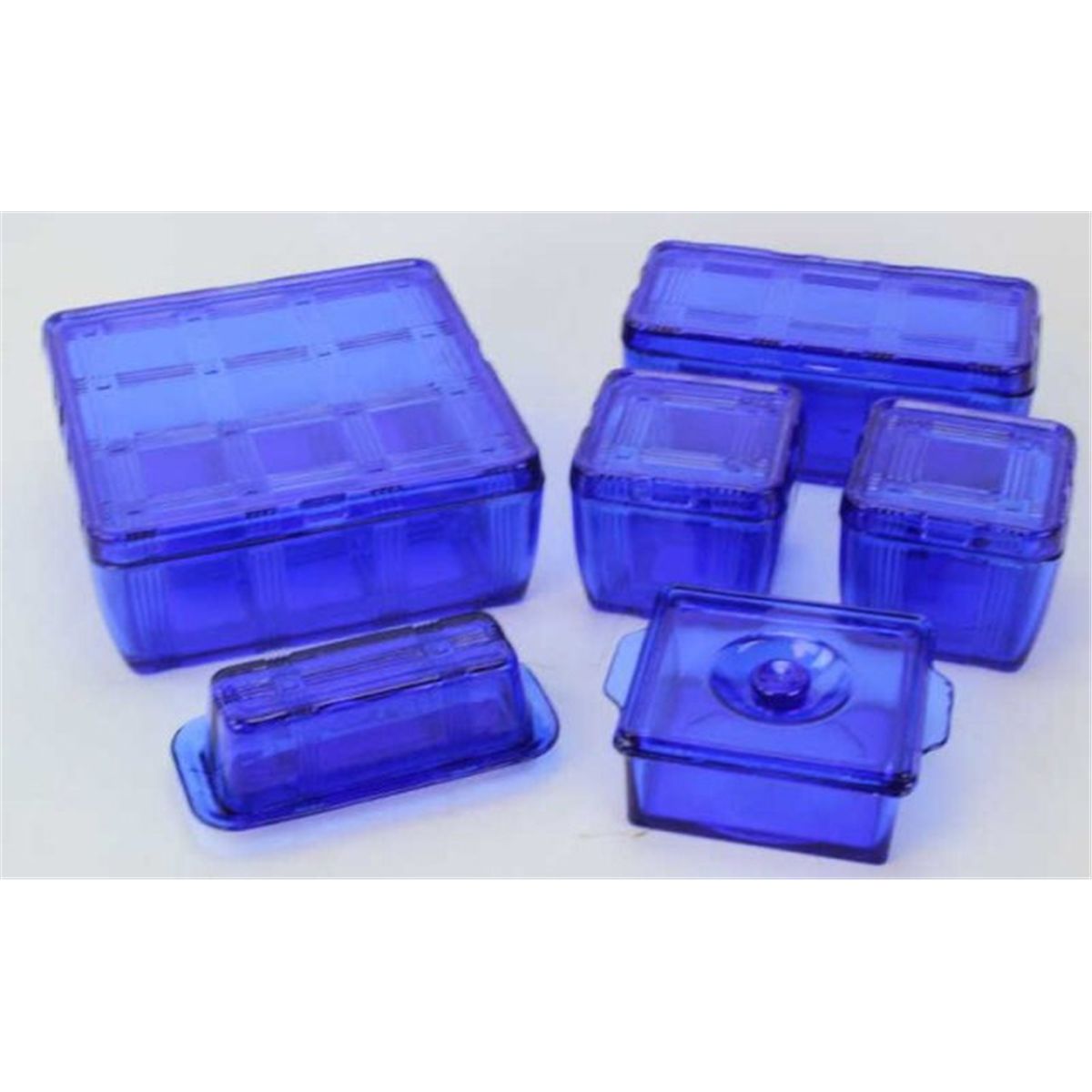 Collection of 6 vintage lidded refrigerator bowls and butter dish, all cobalt blue.