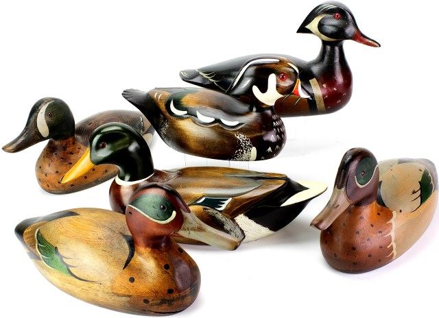 2 stamped Wooden Bird Factory and signed by the artist, 3 marked Tom Taber and 1 signed Kottie. Est. 100-200