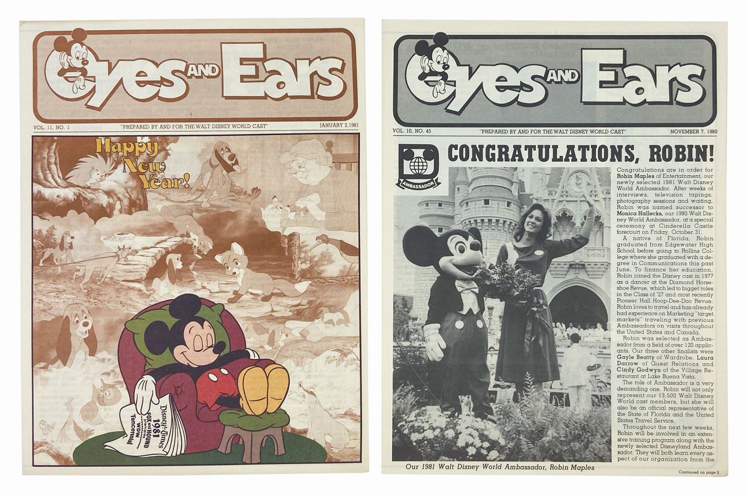(Walt Disney World, 1979-81) A collection of (63) early issues of Walt Disney World Eyes and Ears. This periodical was prepared by and for the Walt Disney World cast members. This collection includes Vol. 9 No. 13, 17, 23, 24, 25, 26, 29, 41, 42, 44, 46. Vol. 10 No. 1, 2, 2, 4, 6, 5, 7, 13, 15, 16, 17, 20, 22, 23, 24, 25, 26, 27, 28, 29, 30, 31, 33, 36, 37, 38, 39, 41, 42, 44, 45, 48, 49, 50. Vol. 11, NO. 1, 2, 10, 25, 27, 28, 31, 31, 32, 32, 33, 34, 35, 37, 45, 47, 48, 50. They each measure 11"x8.5" and have approximately 4 pages in each issue. They are in good condition with minor wear and discoloration to edges from use.