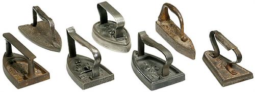 7 Flacheisen 1) "Le Vimev", Nr. 6, Länge 17 cm. - 2) "Le Caiffa", Nr. 5, Länge 16 cm, mit Relief "Der Pfeifenraucher". - 3) Plätteisen, Schmiedeeisen, mit offenem Griffbügel, Länge 19,5 cm. - 4) "Le Parisien", Nr. 5, Länge 16 cm. - 5) Flacheisen mit Anker und Initialien CF, Länge 15 cm. - Und: 6) "SIV", Nr. 5, mit Kleeblatt, Länge 17 cm. - Sowie: 7) Handgeschmiedetes Flacheisen, Länge 17 cm.