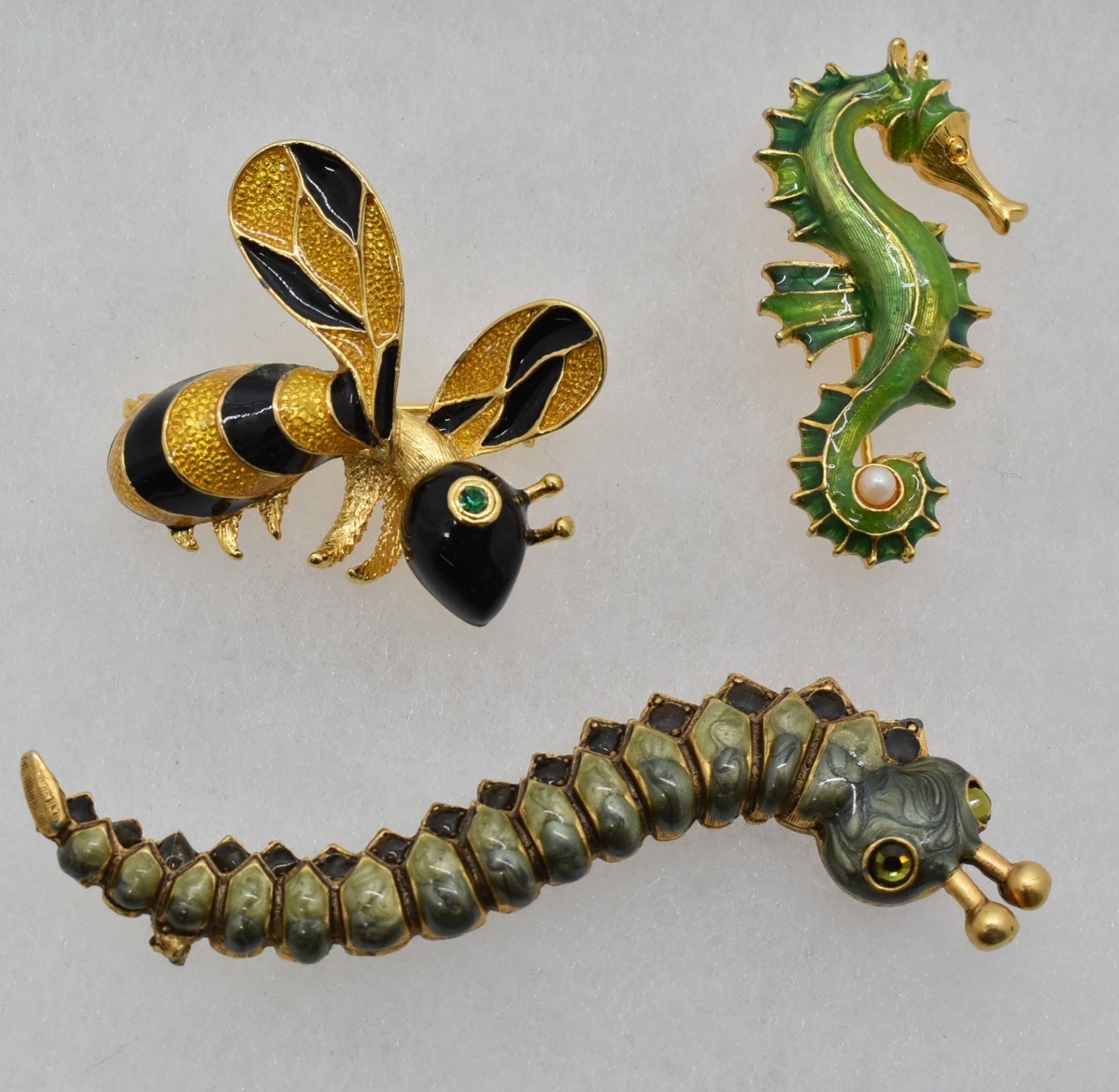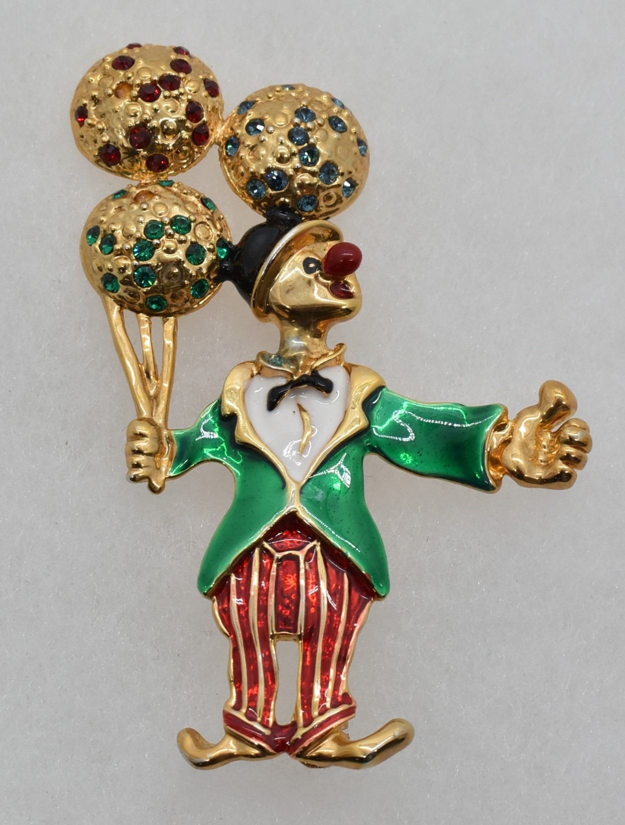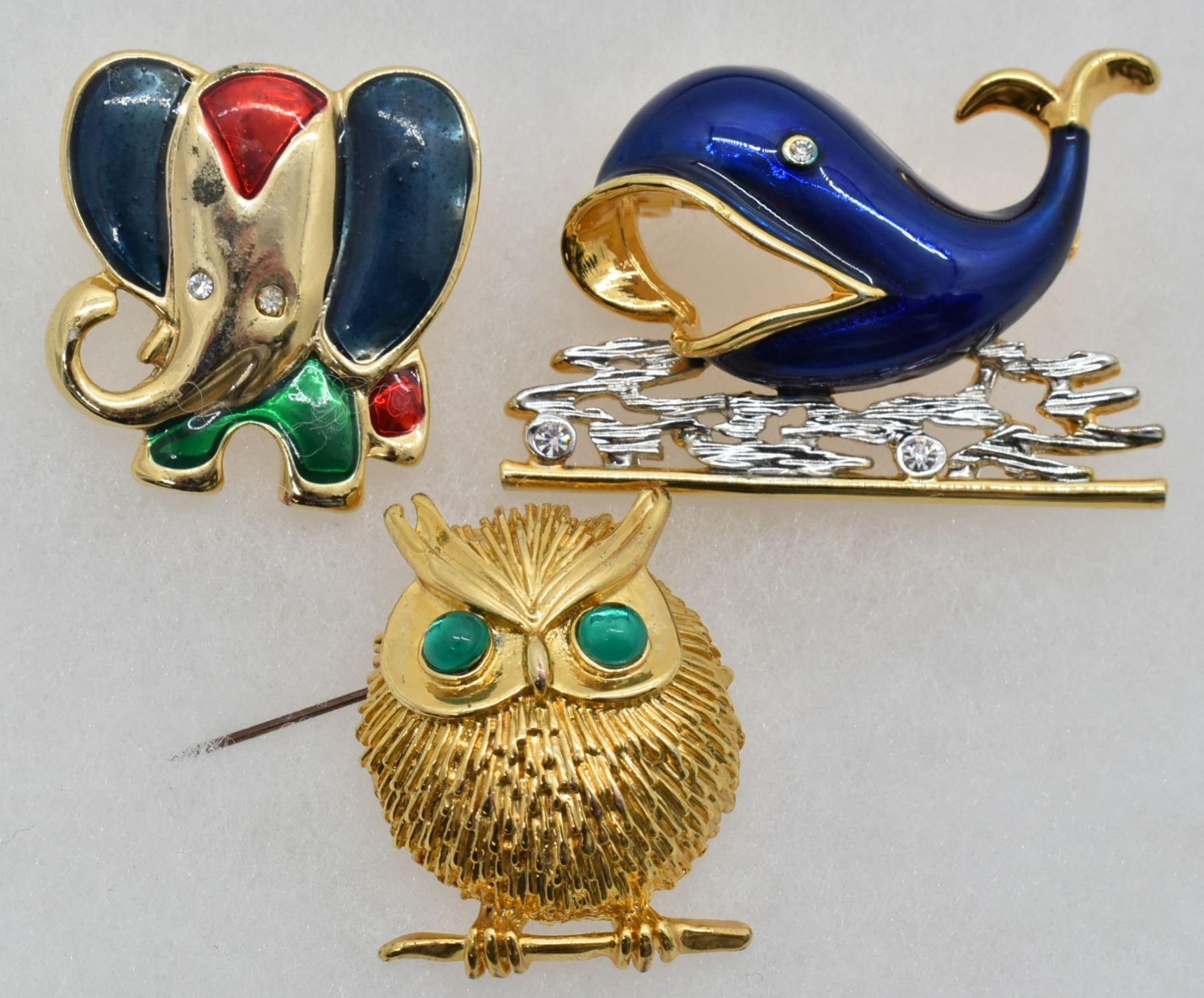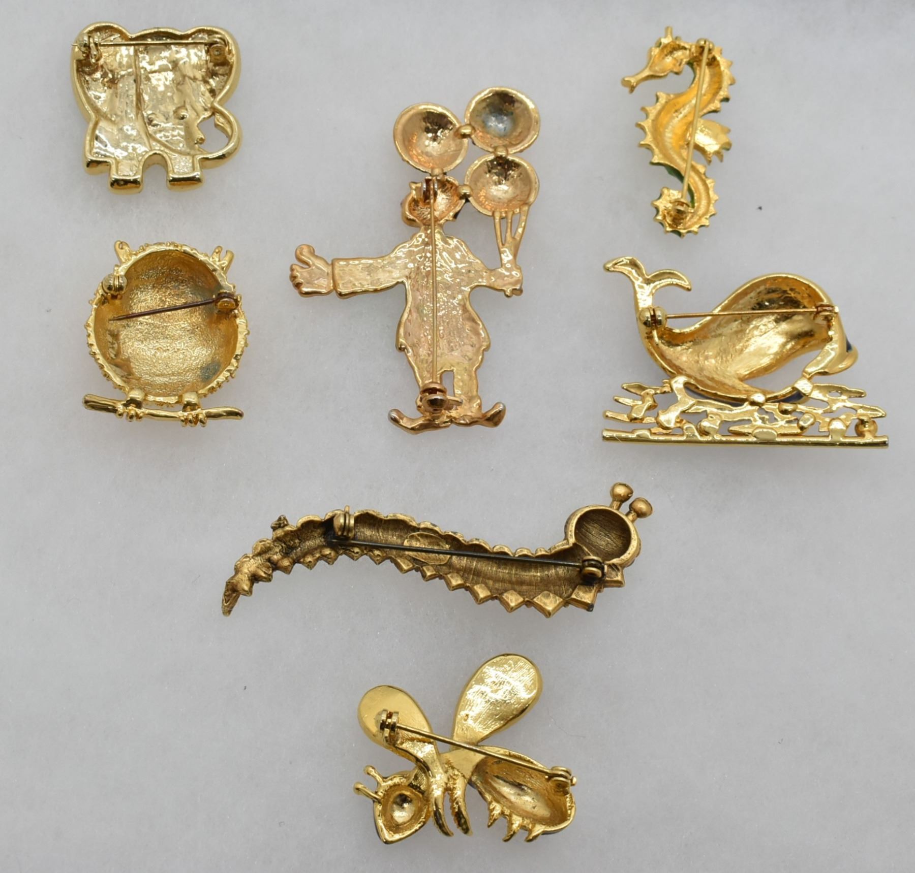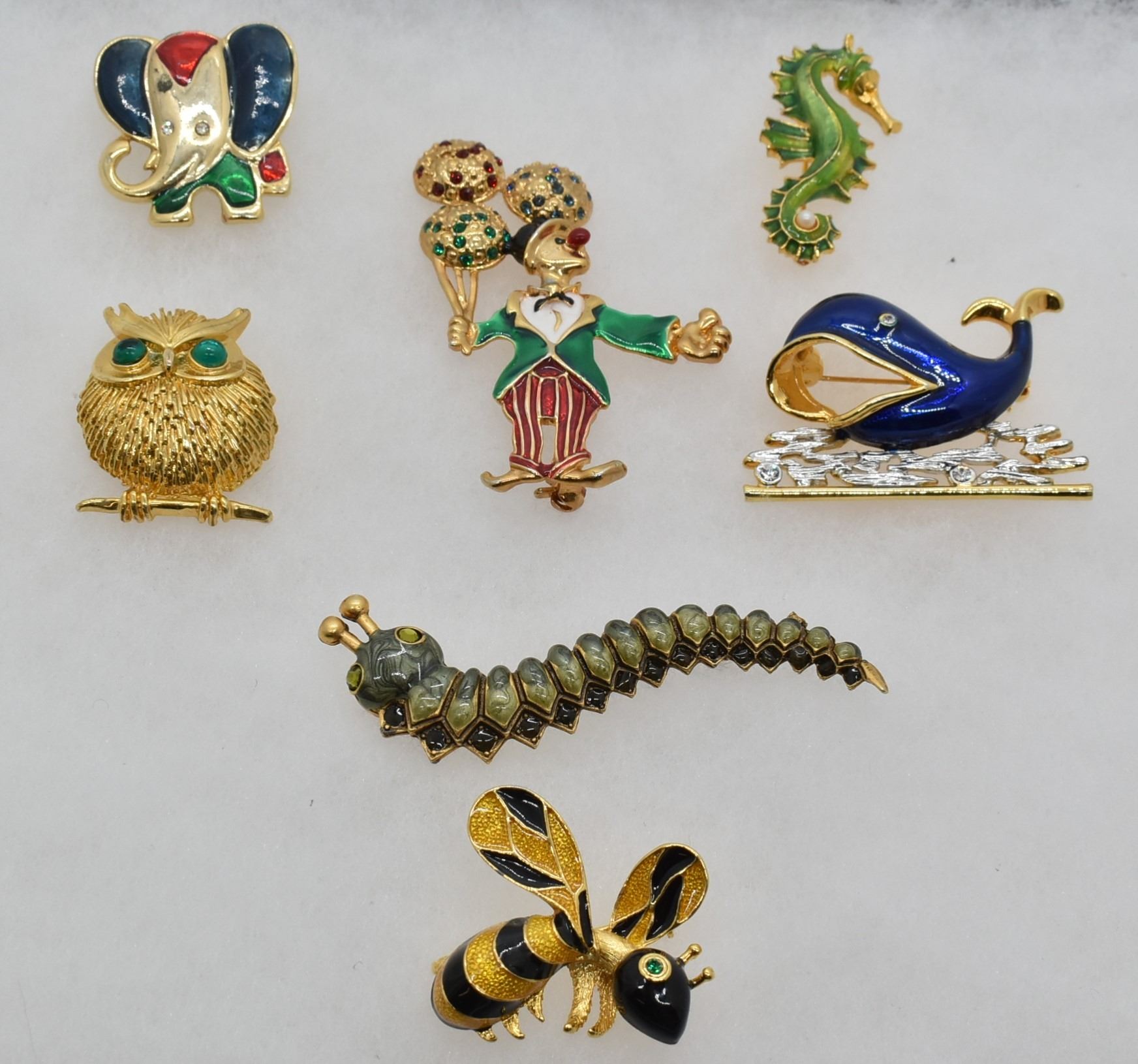 Collection of 7 Holiday & Everyday Pins, festive collection of pins with rhinestones of every color, enamel, brushed textured gold, there's a blue whale with rhinestone eye, a wise owl with green glass eyes, a hitchhiking clown with an enamel suit and 3 rhinestone-bedecked balloons, an enamel seahorse with a single pearl, an enameled elephant of many colors, a black and gold bumbebee with a green rhinestone eye and lastly, an enameled inchworm with peridot rhinestone eyes, all seven with safety pin closures, largest measures 5''L (inchworm)