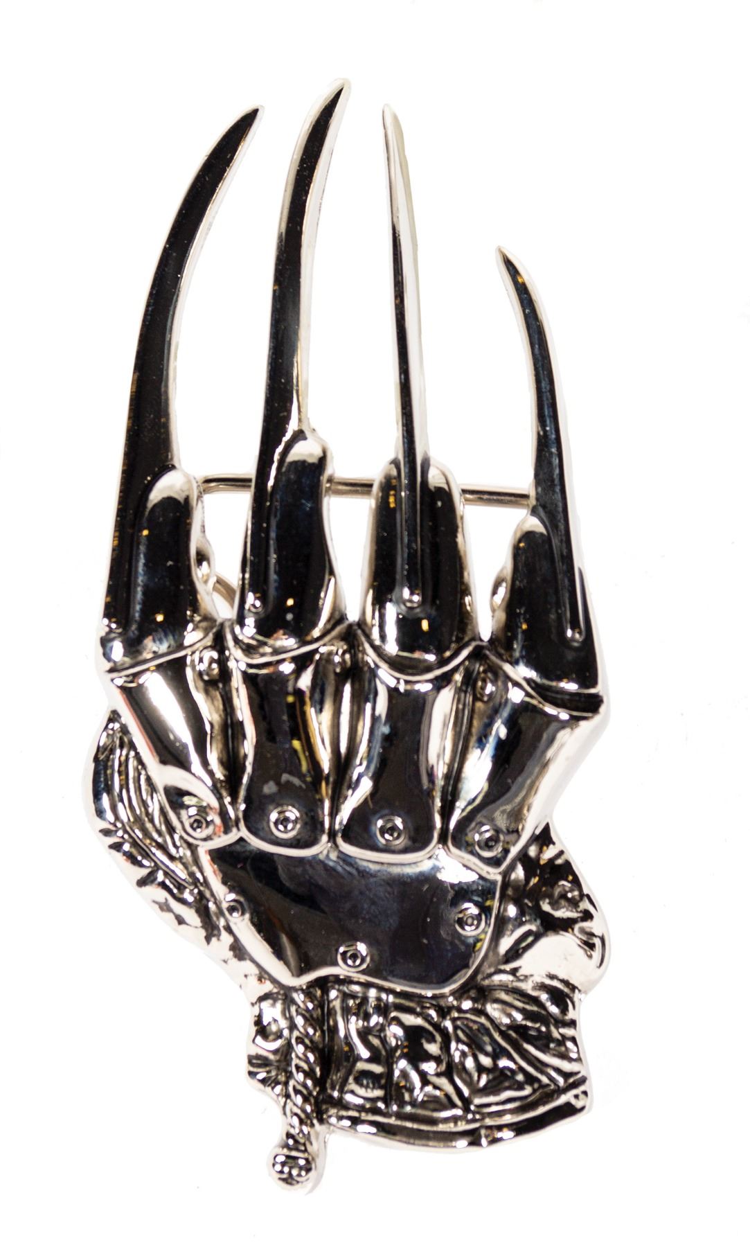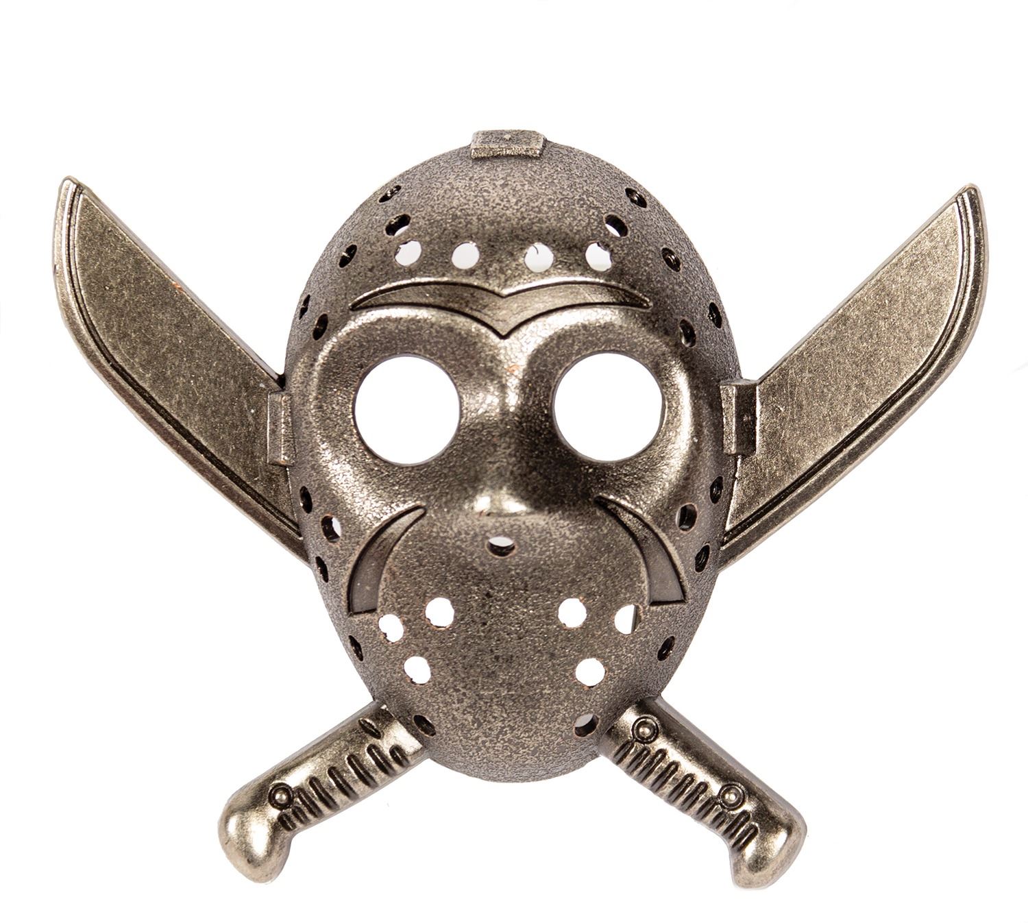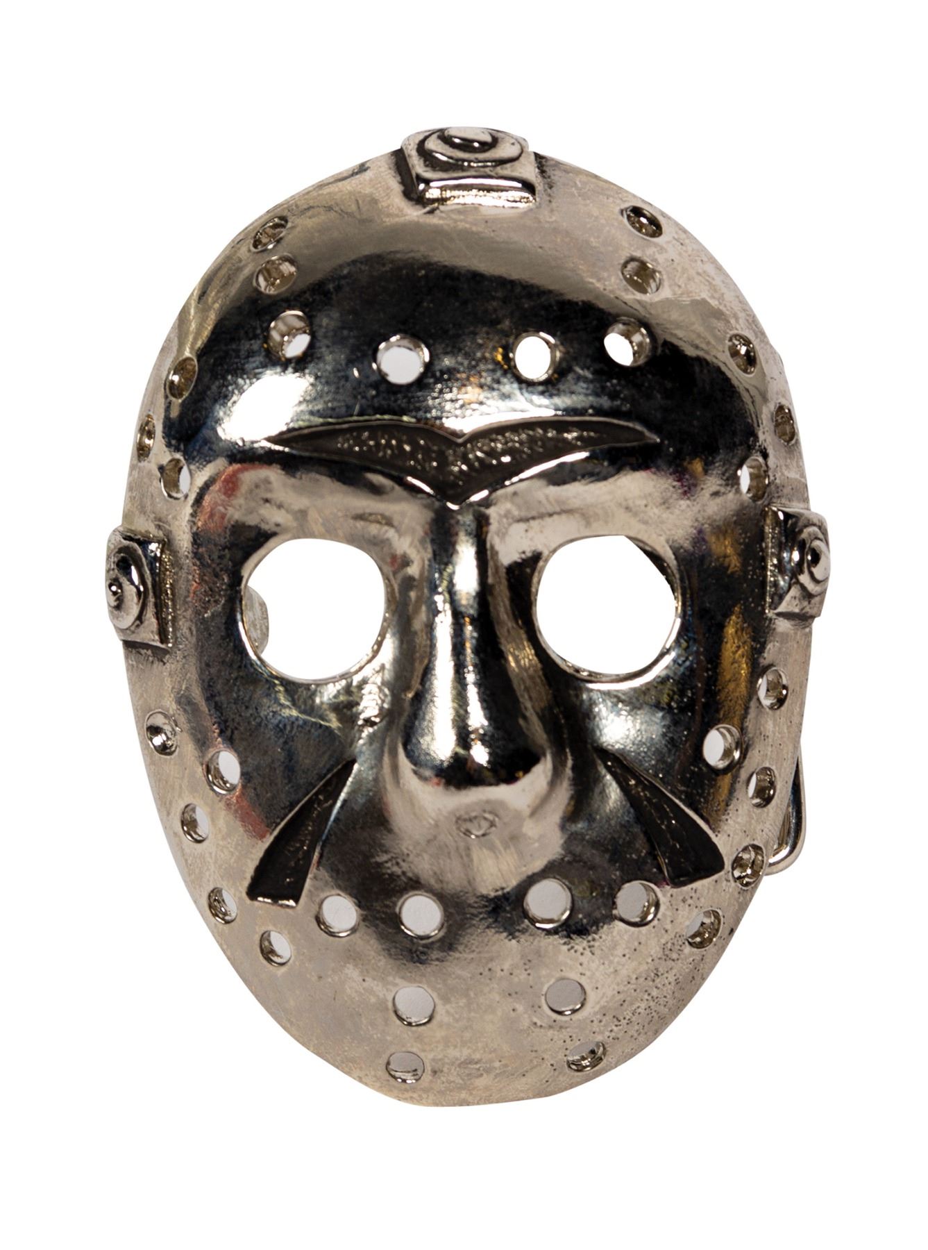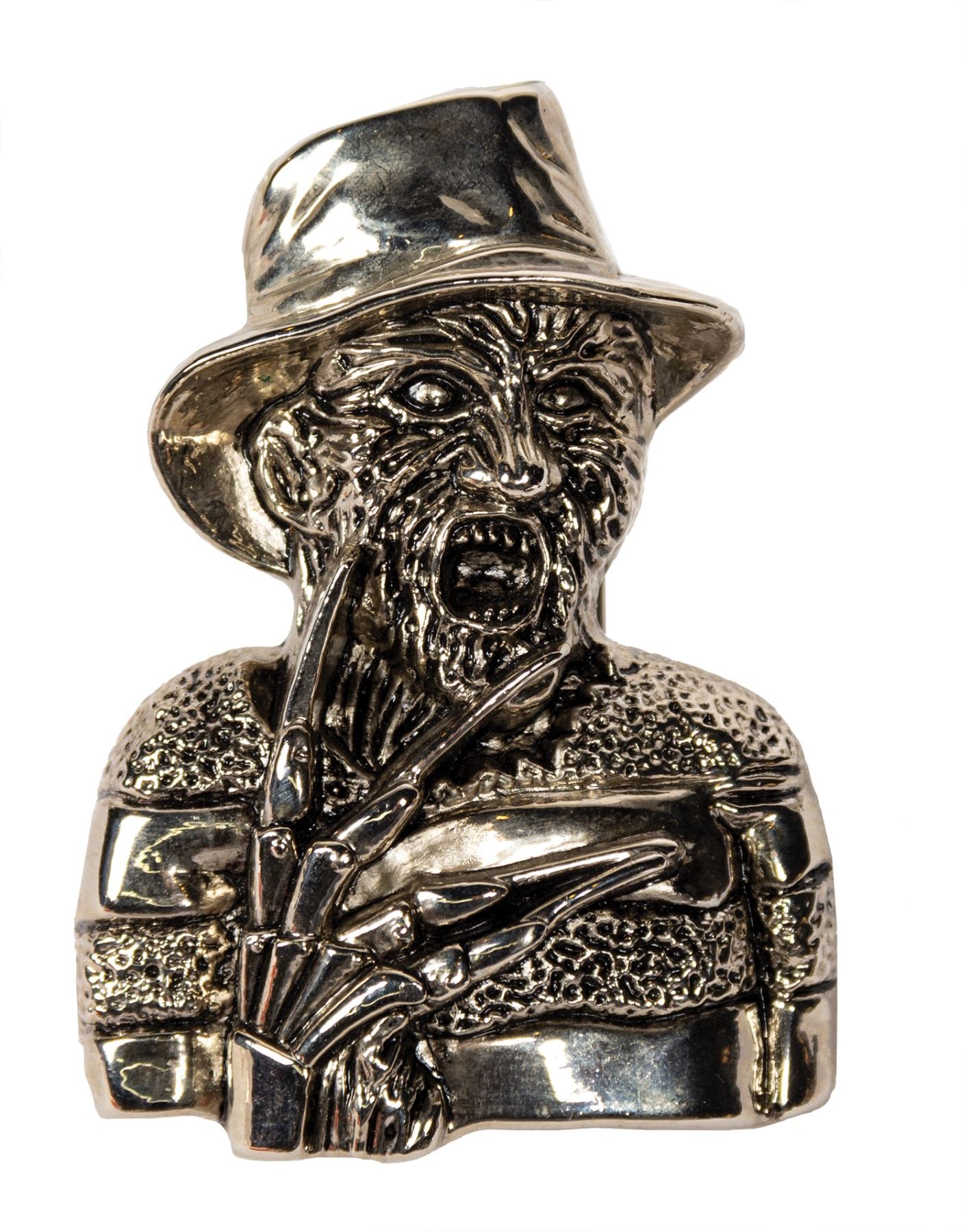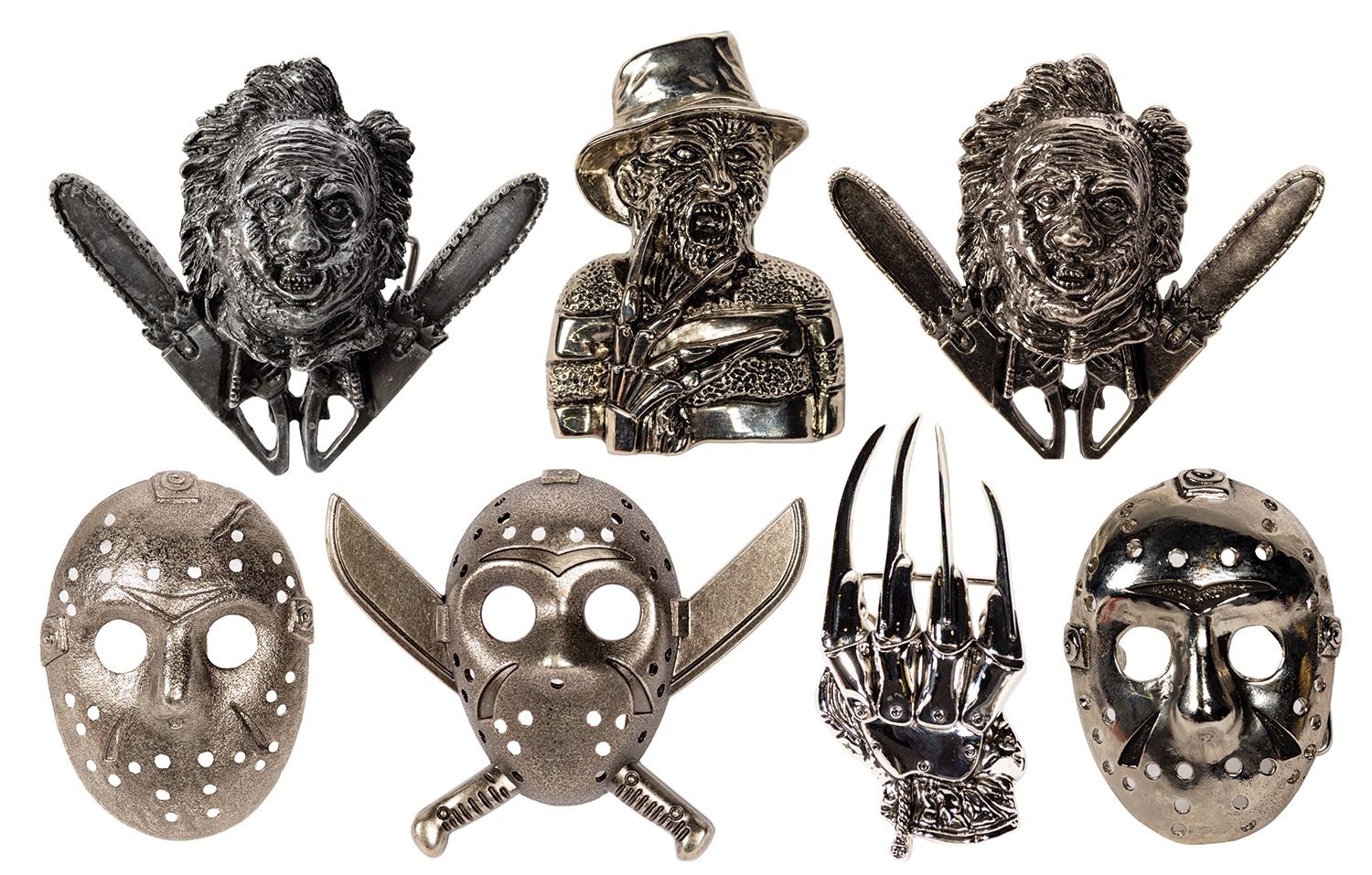 (Assorted, c.2000s) A collection of (7) production samples for belt buckles depicting various characters and imagery from popular horror films. Created by the clothing brand Rock Rebel, these metal buckles are based on the films Friday the 13th, Nightmare on Elm Street, and The Texas Chainsaw Massacre. The buckles measure between 2.5"x5" and 4"x5", and the condition is very good with minor wear.