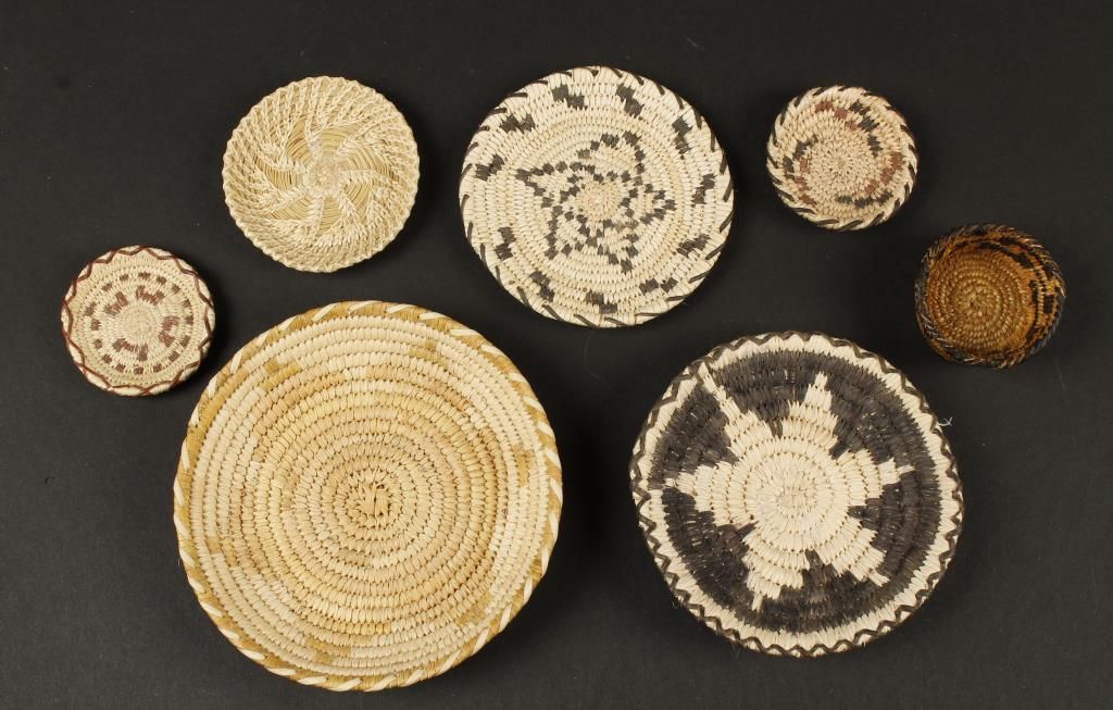 (1) Pima-willow and cat claw design. Rare piece, finely woven, in overall excellent condition. 5/8" tall x 1-1/2" diameter. (1) Papago 1" high x 4" diameter. (1) Papago 3" diameter x 1/8" high. (1) Papago 3-1/2" diameter x 1/2" high. (3) Small flat baskets, tightly woven from 1-3/4" to 2-1/4" diameter.