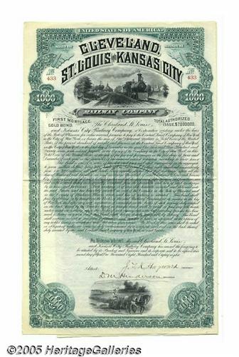 <B>Collection of 7 Very Graphic Uncancelled Railroad Bonds</B></I> Includes the following: 1. Arkansas, Louisiana & Gulf Railway Company, uncancelled $1,000 gold bond, Arkansas, 1907. 2. Cleveland, St. Louis & Kansas City Railway Company, uncancelled $1,000 gold bond, Missouri, 1888. 3. Boston, Hartford & Erie Railroad Company, uncancelled $1,000 bond, New York, 1866. 4. Maryland Central Railway Company, uncancelled $1,000 gold bond, Maryland, 1889. 5. Pennsylvania, Poughkeepsie & Boston Railroad Company, uncancelled $1,000 gold bond, New Jersey, Pennsylvania, 1889. 6. Poughkeepsie, Hartford & Boston Railroad Company, uncancelled $1,000 bond, New York, 1875. Impressive. 7. Woodruff, Sleeping & Parlor Coach Company, uncancelled $1,000 bond, Pennsylvania, 1888. Especially graphic and colorful collection of 7 uncancelled railroad bonds. The very finest quality. Choice condition. Great for framing. Lot:253