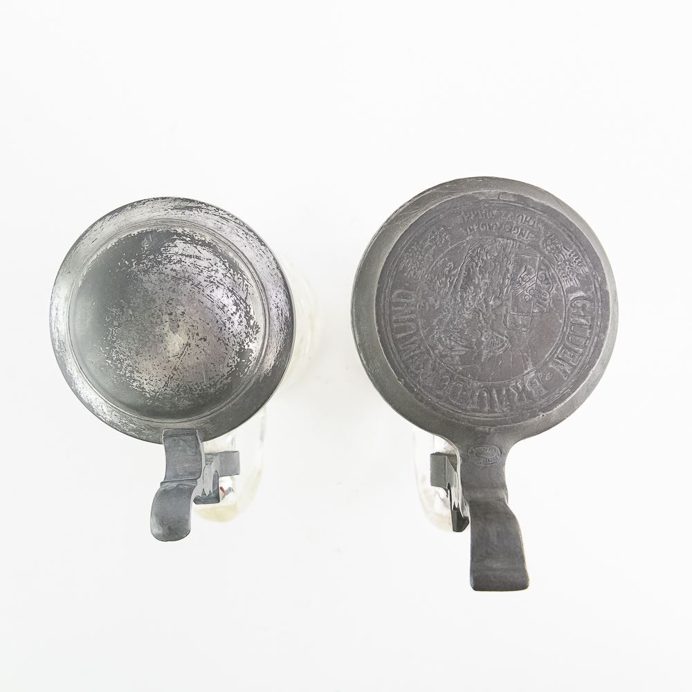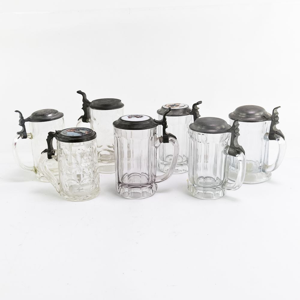 Collection includes (7) vintage lidded glass beer stiens and mugs. Perfect addition for your cabinet or bar. Please use photos to judge condition and bid accordingly.