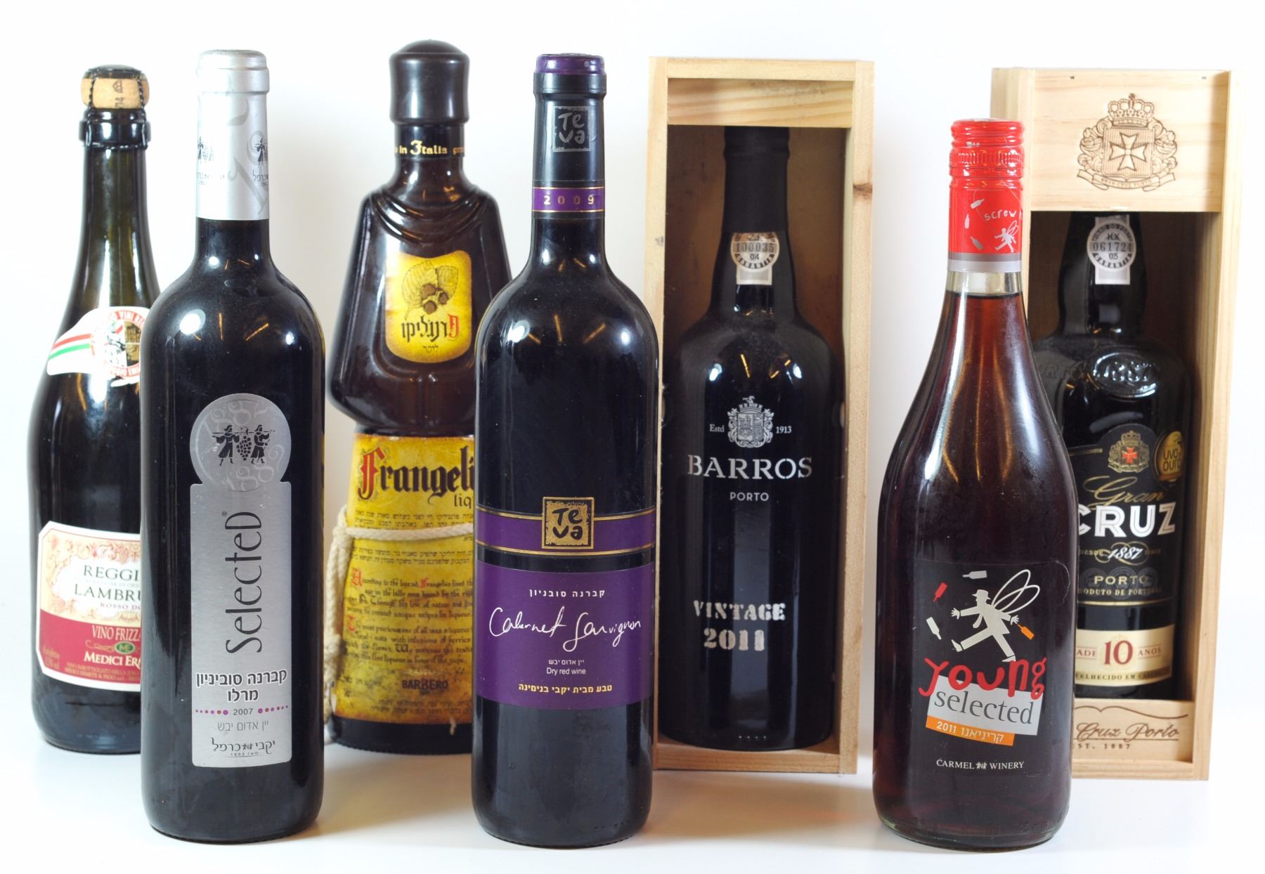 Collection of 7 alcoholic beverages: 1. 2011 Portogese wine Barros Porto,comes in original wooden case 2. Portogese wine Gran Cruz Porto, 2015, comes in original wooden case 3. Lambrusco Rosso Dolce, Italy, 2014 4. Cabarnet Saovignon Merlot, Selected, Carmel Vineyards, 20007 5. Caringnano, Young Selected, Carmel Vineyards, 2011 6. Cabarnet Sauvignon, Binyamina Vineyards, 2009 7. Frangelico liqueur, Italy, 2007. The conditions in which the bottles have been stored is unknown, sold as they are!