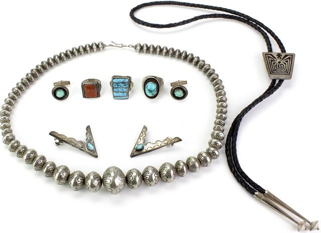 bead necklace comprised of 65 heavy hollow beads possible old pawn, 23" lover, sterling bolo hallmarked on reverse, collar tips, cuff link set with turquoise, and 3 large rings. Est. 300-500