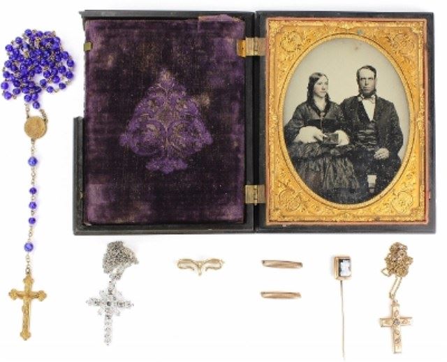 1 1/2" with chain, 2- 10K marked tie pins, 14K marked pin, unmarked Victorian stick pin with cameo knight figure, early unmarked blue beaded rosary and silver costume cross and large unknown Frawley family ambro type in Gutta Percha case, 5" X 6". Est. 200-400