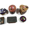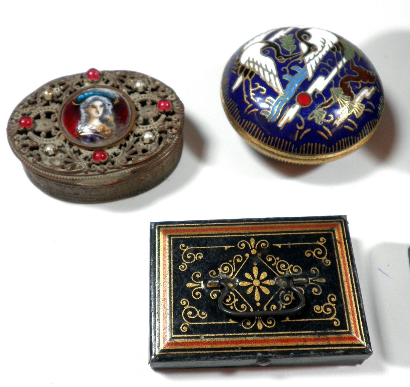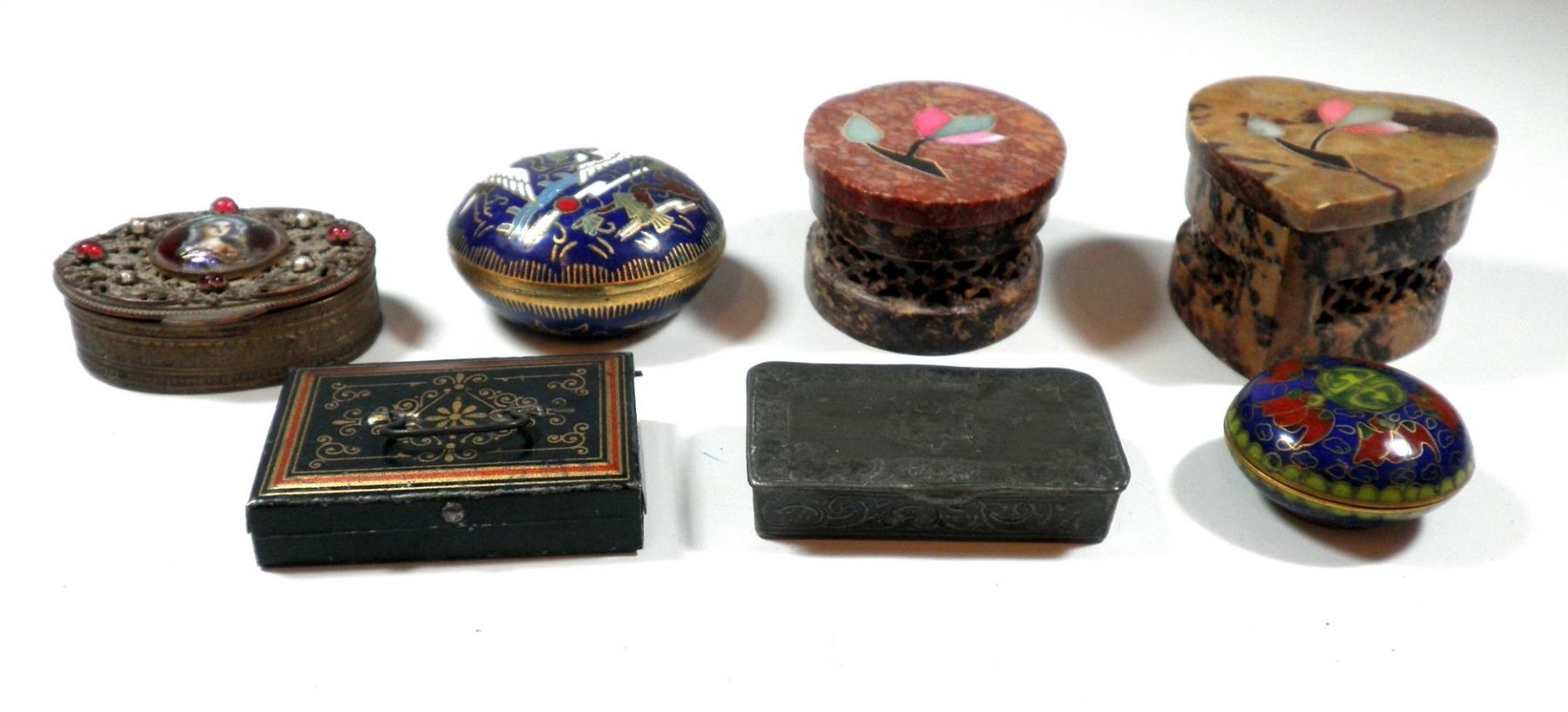 Collection of 7 old tobacco and pill boxes: 2 marble boxes decorated on the lid with flower-shaped nacre settings, 2 Chinese pill boxes with cloissone embellishments, Victorian brass tobacco sniff box, pierced lid with colorful glass settingsin the middle and an enamel plaque with a hand-painted nobel woman, pill box shaped like a savings-box and an antique pewter pill box with flower patterns.