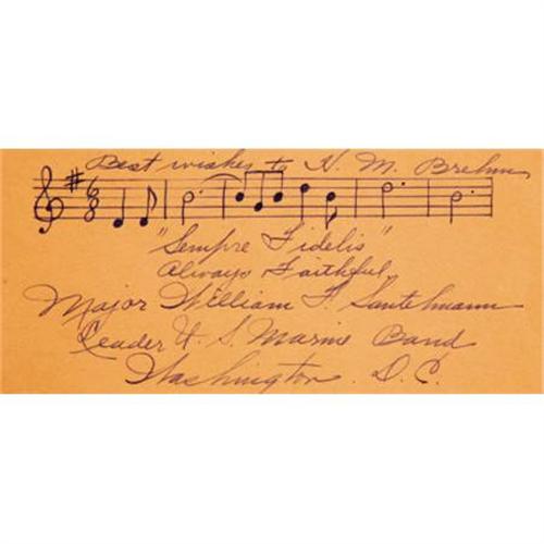 <B>Collection of Autograph Musical Quotes Signed</B></I> consisting of eight items, all in ink on colored cardstock, approximately 5.5" x 2" or larger in size. Includes: <B>Howard Hanson</B></I> (1896-1981)- two neatly penned bars of the cello part of his Symphony No. 1 "Nordic" (first movement); <B>Maj. William F. Santelmann</B></I> (1902-1984)- bars of the official Marine Band march "Sempre Fidelis" with inscription; <B>Vladimir Golschmann</B></I> (1893-1972)- dated 1948; <B>Douglas Moore</B></I> (1893-1969)- two bars from his opera <I>The Devil and Daniel Webster,</B></I> dated 1948; <B>Ernst Hoffman</B></I> (1899-1956)- four notes not on staff (Beethoven's 5th opening?); <B>Roger H. Sessions</B></I> (1896-1985)- dated 1948; <B>Hans Kindler</B></I> (1892-1949); and <B>Alexander Smallens</B></I> (1889-1972). All in fine condition and mounted on larger cards with typewritten biographical information.<BR><BR><b>Shipping:</b> Flat Material, Small (<a target="_blank" href="http://www.heritageauctions.com/common/shipping.php">view shipping information</a>)
