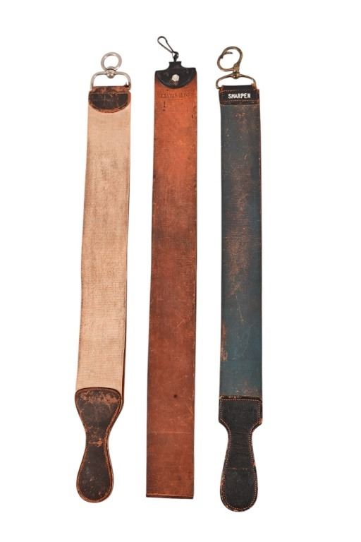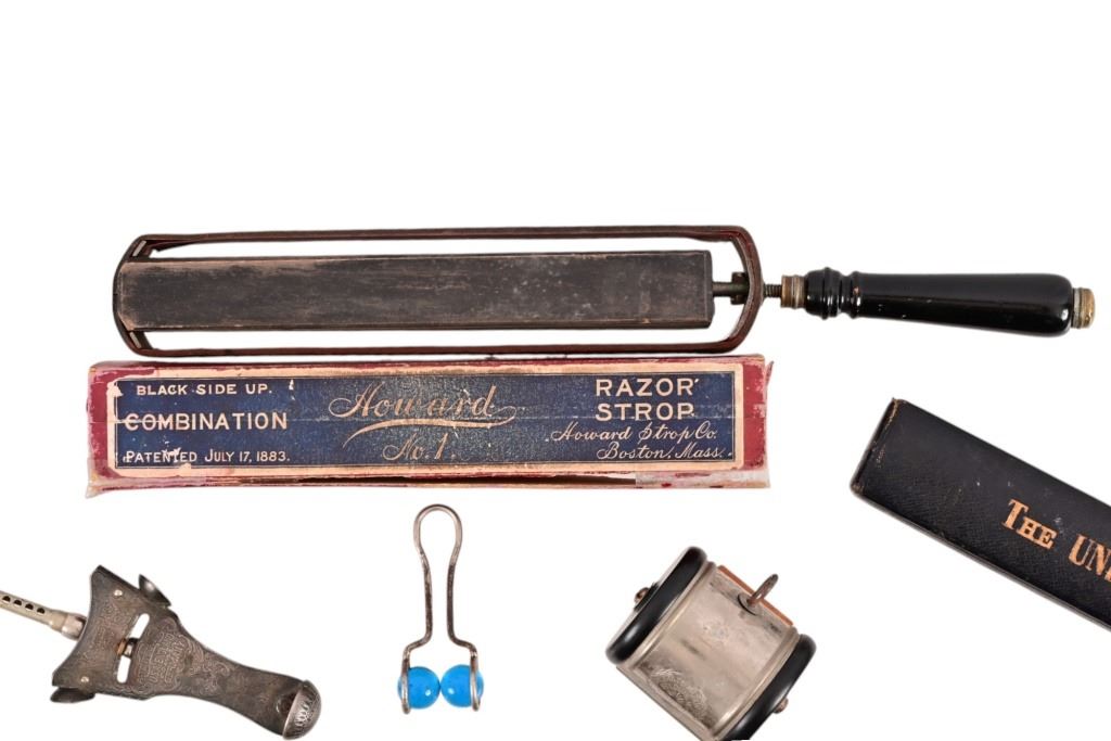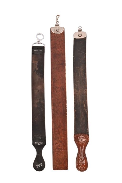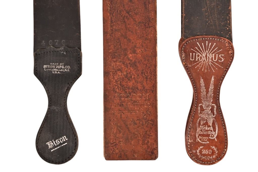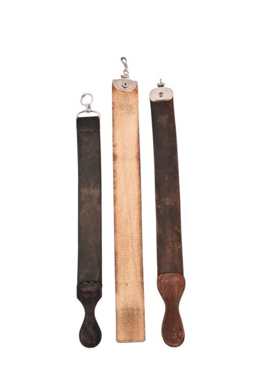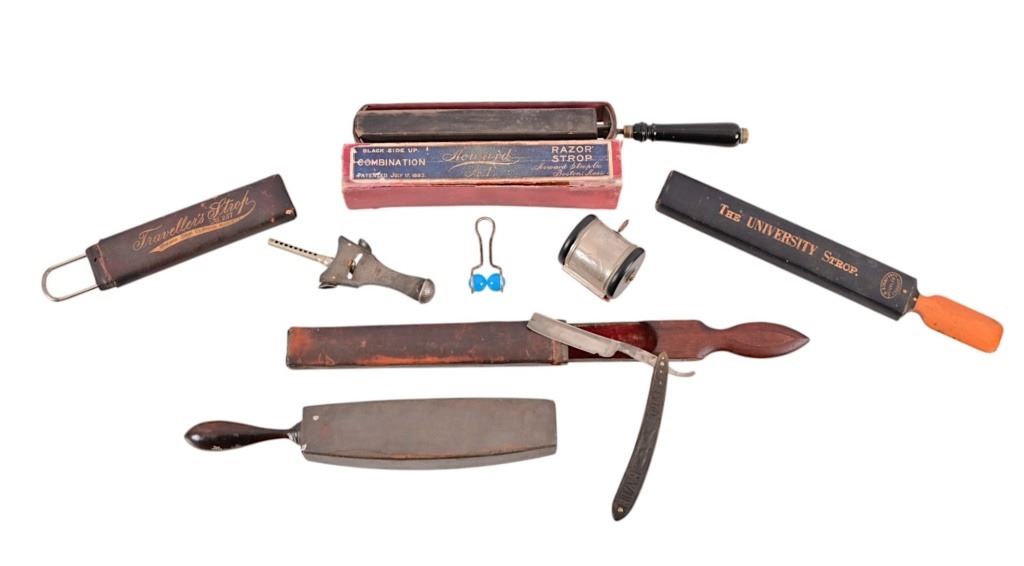 Comes with 6 Strops, 1 Star Stropper and 1 blade sharpener..Howard No. 1 Razor Strop, Howard Traveller's Strop, G.H. Staniforth Cutler - The University Strop, Shumate Razor Co. Strop, Tally-Ho Razor in case, Kampfe Bros. Star Stropper. 1 no brand strop and razor blade sharpener.