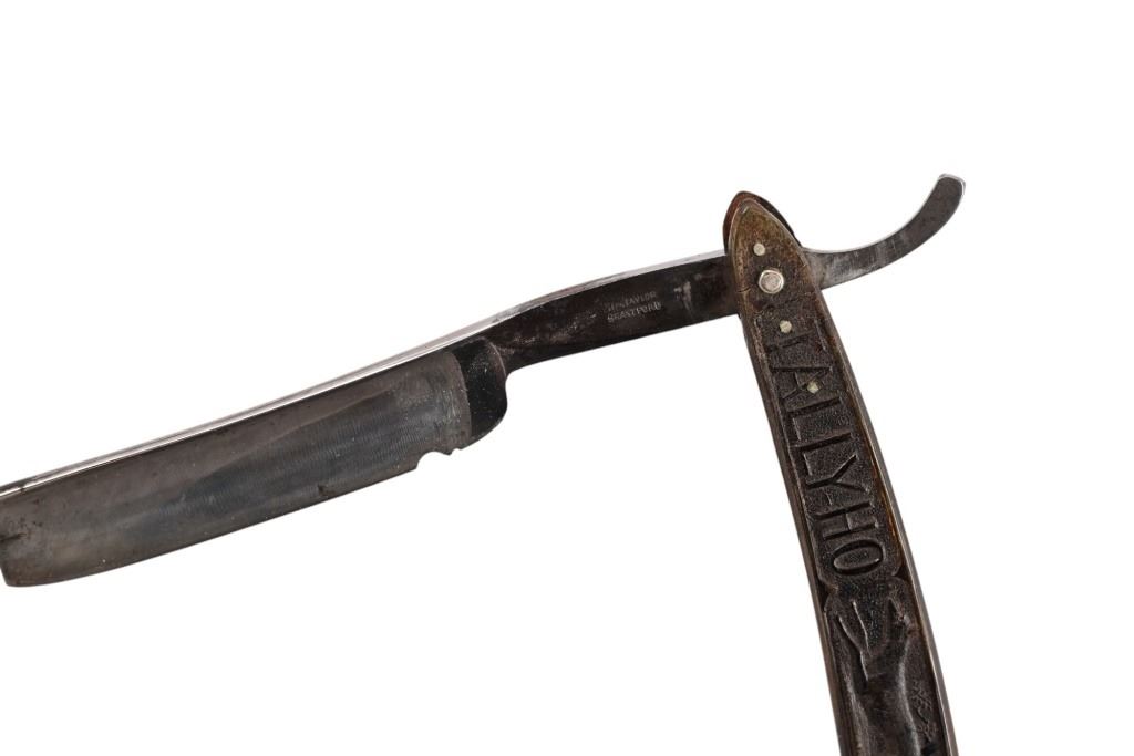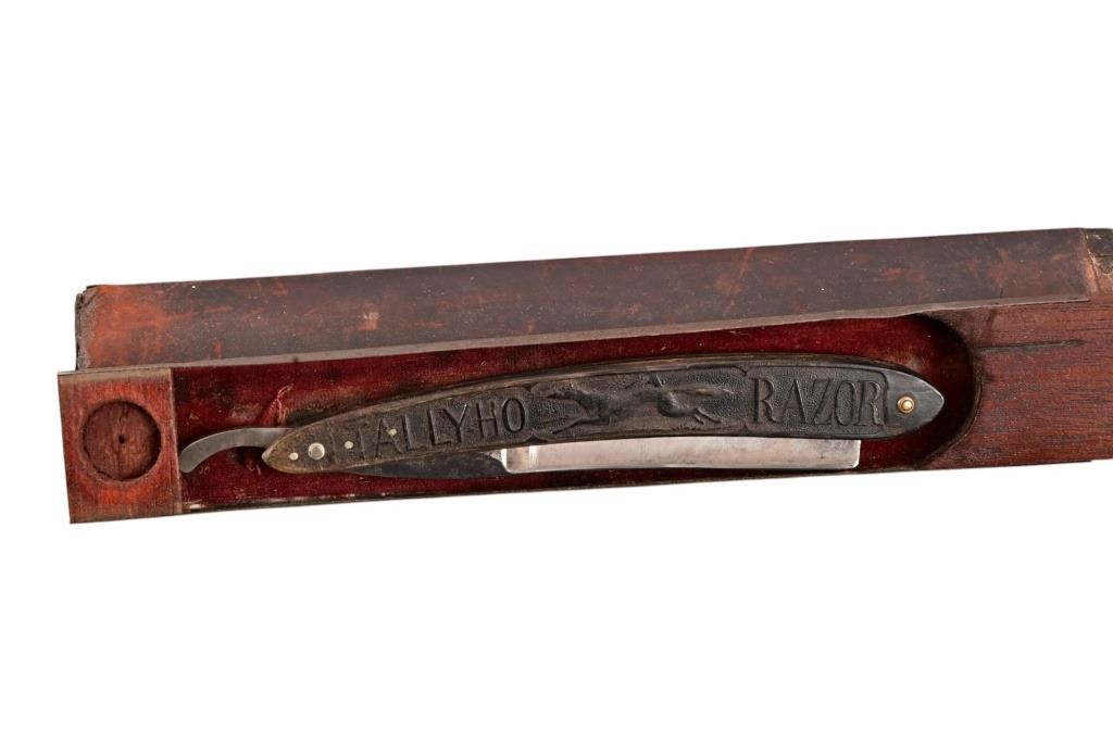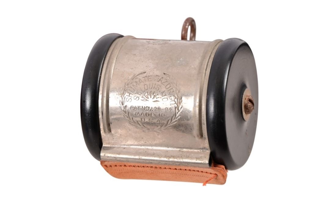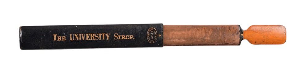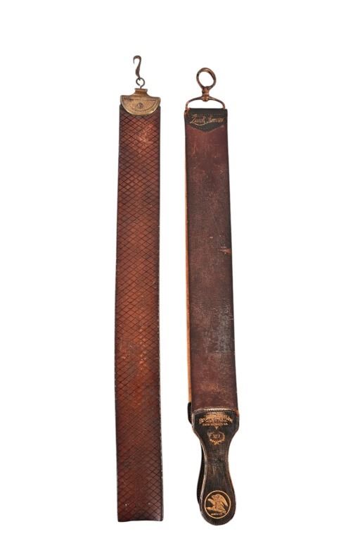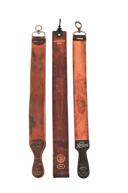 Comes with 6 Strops, 1 Star Stropper and 1 blade sharpener..Howard No. 1 Razor Strop, Howard Traveller's Strop, G.H. Staniforth Cutler - The University Strop, Shumate Razor Co. Strop, Tally-Ho Razor in case, Kampfe Bros. Star Stropper. 1 no brand strop and razor blade sharpener.