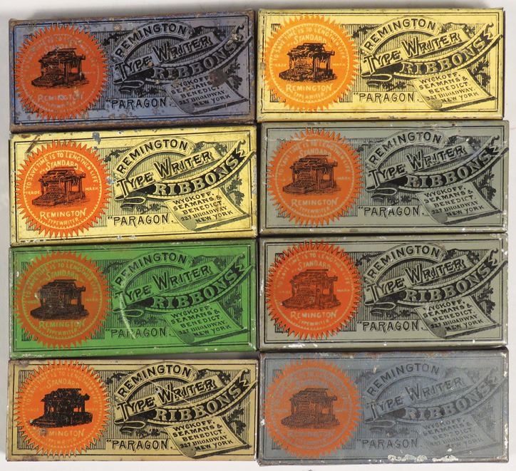 Collection of 8 Early Remington Typewriter Ribbon Tins. Ivory, tan grey and green tins. Overall fair to good condition. 3 1/2 X 1/2 X 1 1/2 inches.