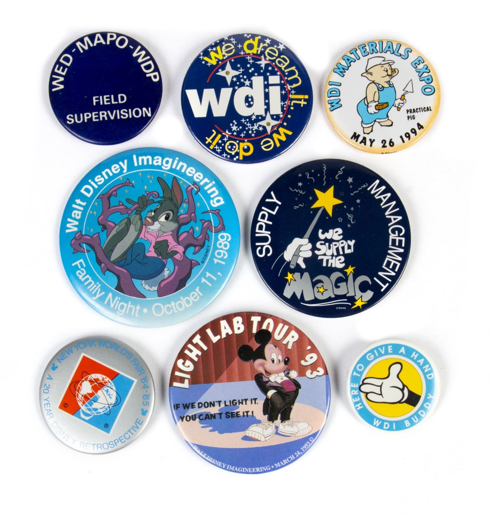 (Disneyland, 1980s-90s) A collection of (8) Imagineering buttons from a variety of projects and events. These buttons represent the diverse projects that Imagineering is involved in, and range from "Splash Mountain", to the 1964-65 New York World's Fair Retrospective, to the WDI Materials Expo. The buttons range in size from 1.75" in diameter to 3.5" in diameter. The condition is good with some wear from use.