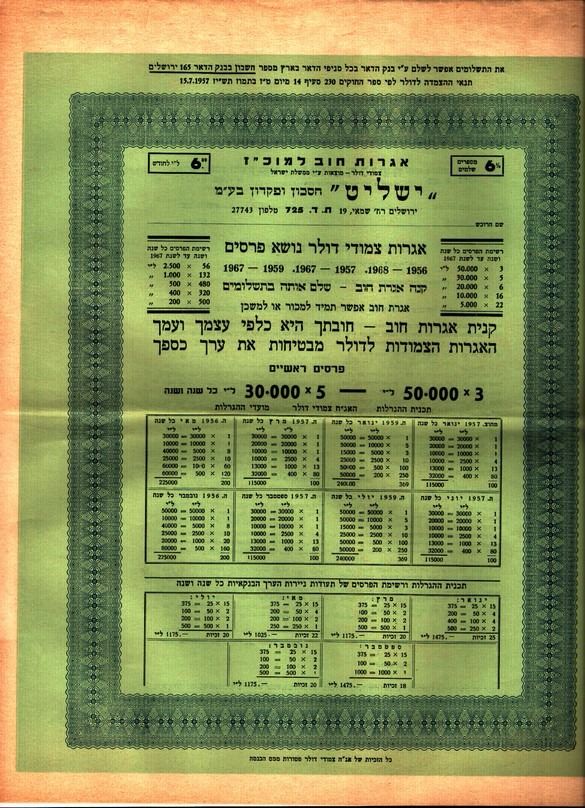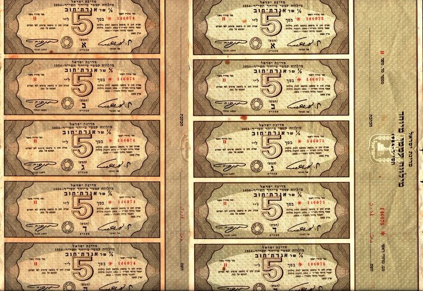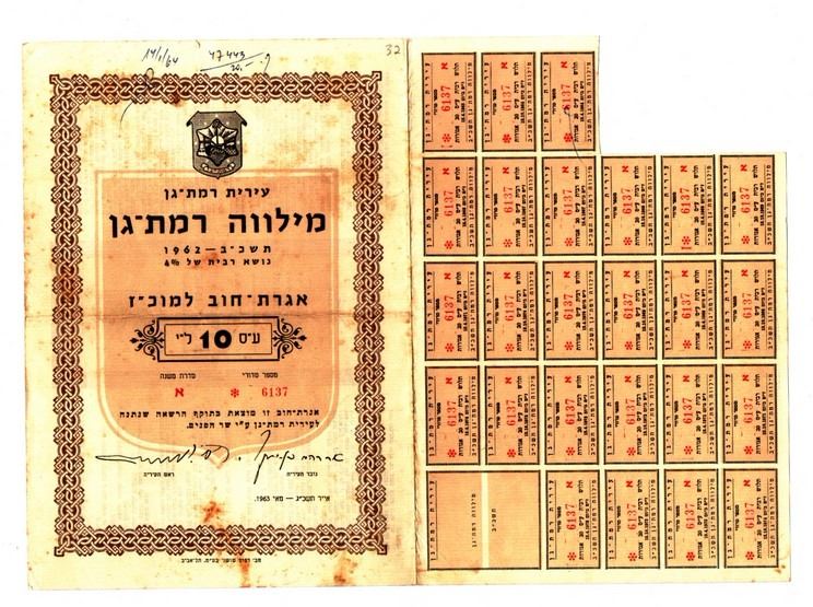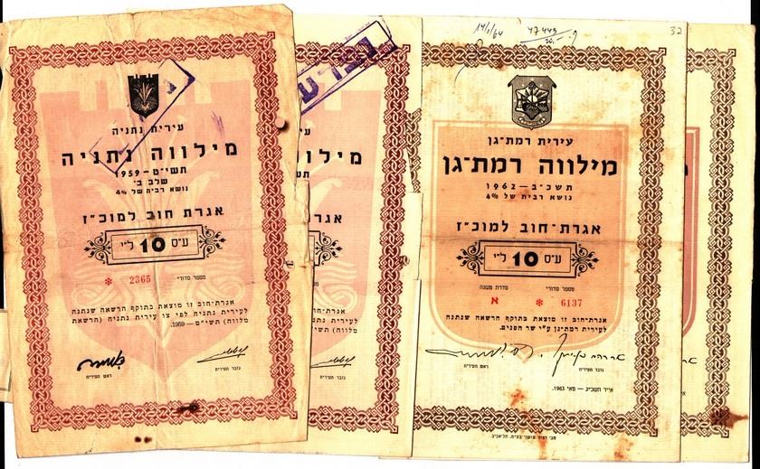 Collection of 8 Israeli bonds, 1960s, includes 2 empty Yashlit Savings and Trust Co. bonds, 2 Ramat Gan Municipality bonds 1960-3, 2 Netanya Municipality bonds 1959, 2 sheets of 10 Amami Meyuhad bonds 1954 in the amount of 5 Israeli lira each. Varbiable conditions.