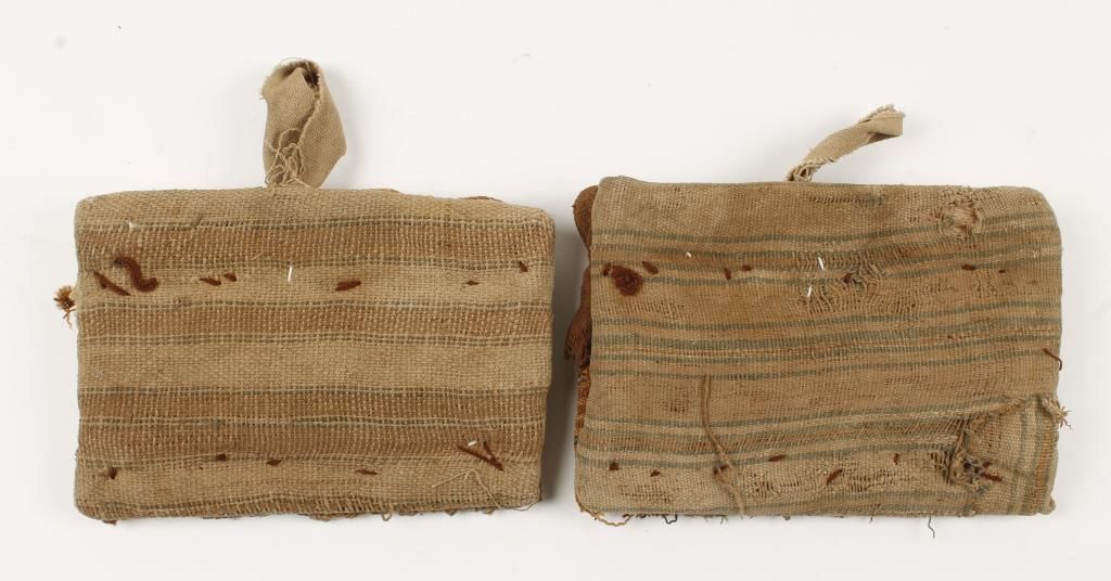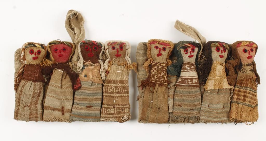 The cloth is from Pre-Columbian burial tombs and made into tomb dolls in modern time. All the cloth is 1000 years old except for the red yarn. In (2) sets.
