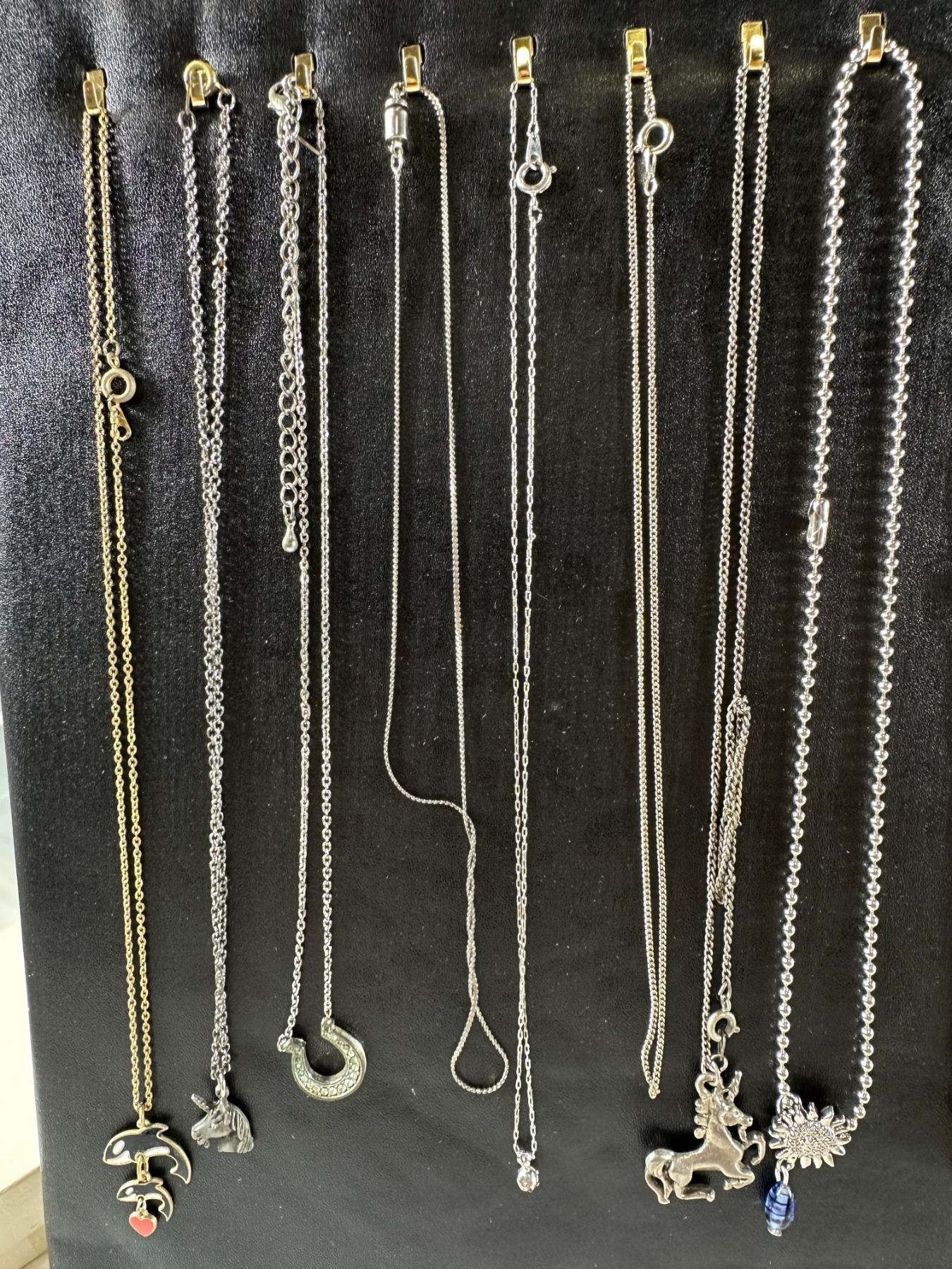 A varied selection of eight vintage and modern necklaces, Includes dolphin with heart charm, unicorn, crescent pendant, crystal drop, and sun with blue bead