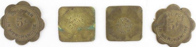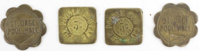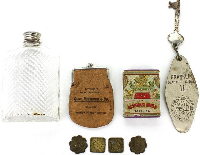 flask, early Franklin Hotel Deadwood room key, Clay Robinson Livestock Commission advertising coin purse, Schinasi Bros cigarette box, 2 St. Onge Pool Hall 5c tokens, and 2 5c Poodle Dog Cafe tokens. Frawley Estate items. Est. 75-150