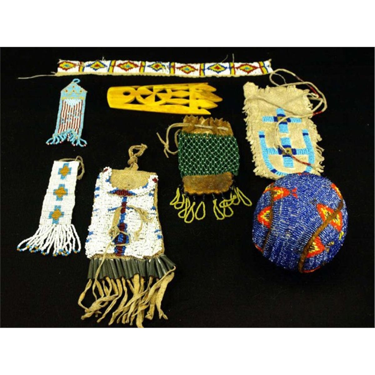 Collection of 8 includes beaded baby ball, fobs, strike a lite bag, elk horn roach spreader, fringed drawstring bag, misc. bead strips and lattice beaded bag, 1920's to contemporary.