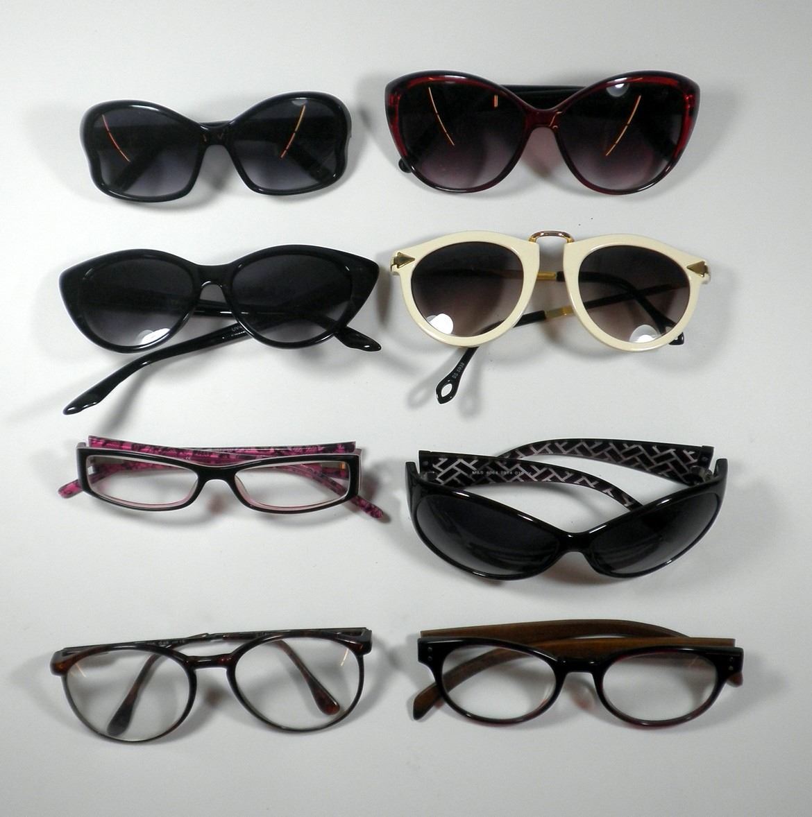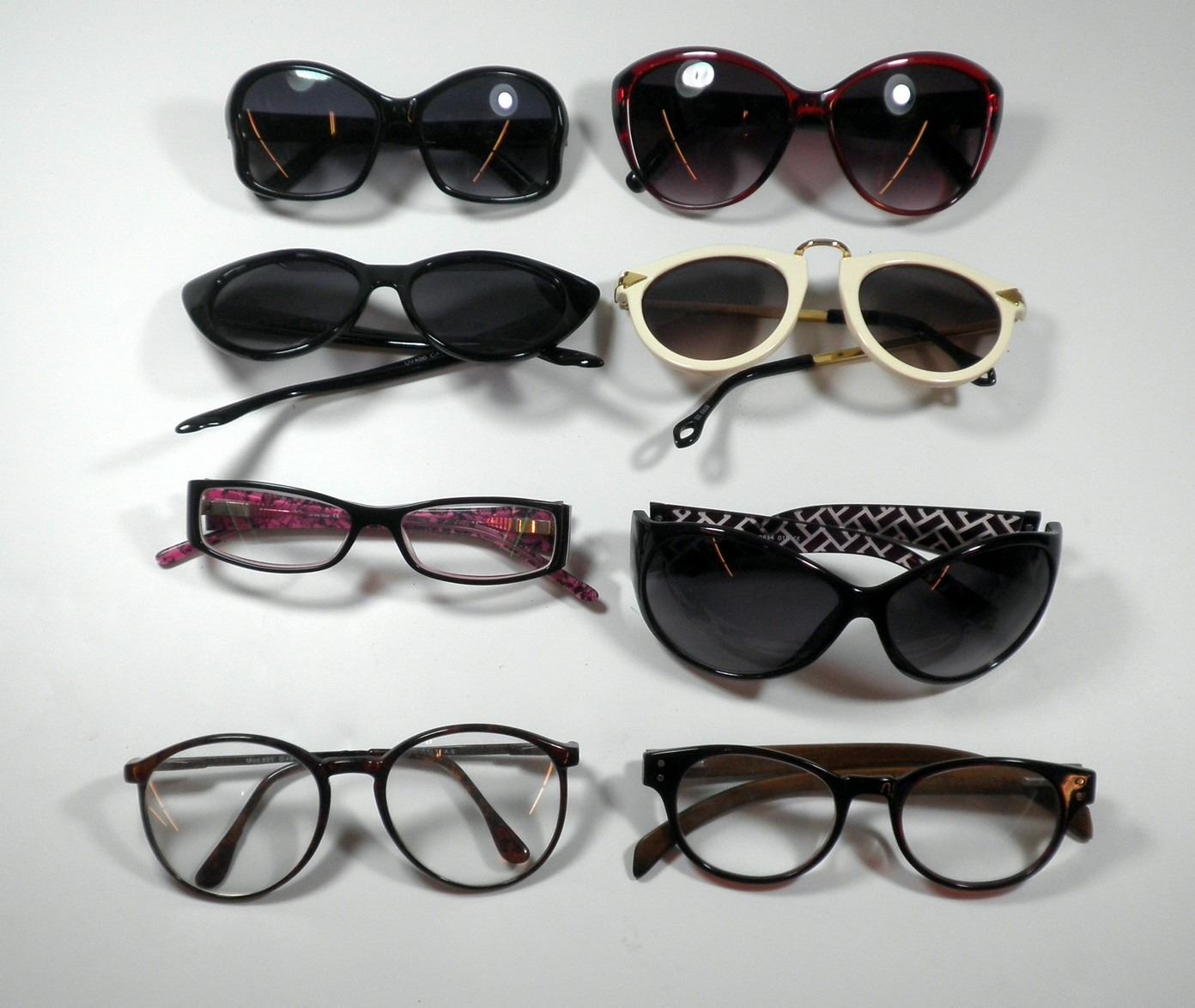 Collection of 8 pairs of vintage glasses: 5 sunglasses and 3 reading glasses, different brands. Overall in good condition: reasonably worn with use.